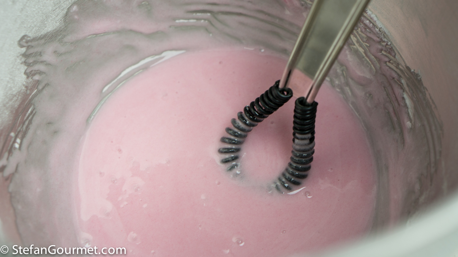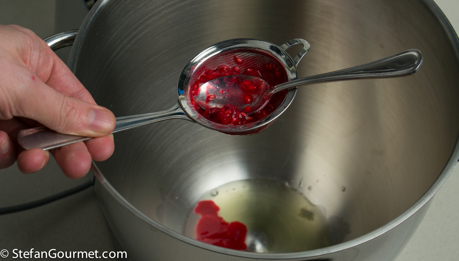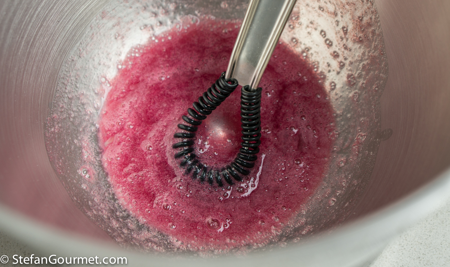 Put 4 raspberries in a sieve and squash them and push down with a spoon to add the juice to the egg white.