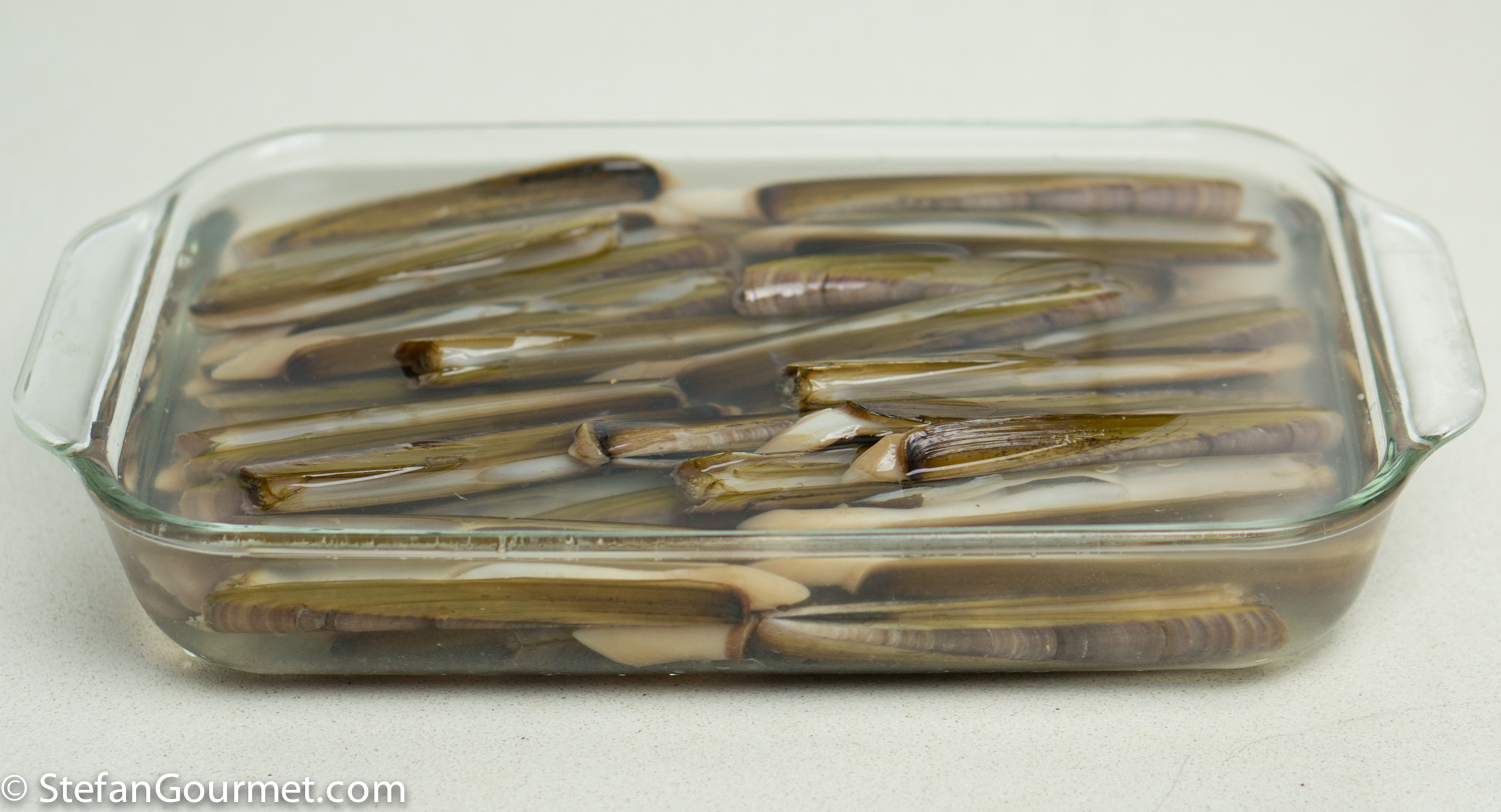 Allow the razor clams to soak in water as salty as the sea (30 grams salt per litre of water or 4 tsp salt per quart of water) for several hours, preferably overnight.