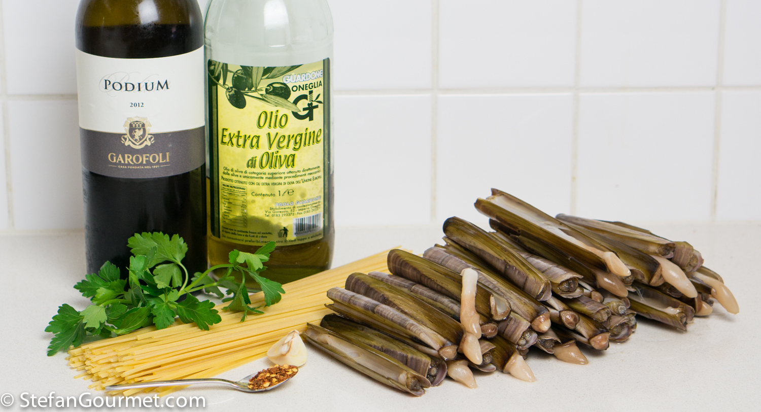 Razor clams are shellfish with an unusual shape. Compared to vongole (clams) they are sweeter and slightly more chewy. The recipe for linguine with razor clams is very similar to that of spaghetti alle vongole. Just like other clams, the razor clams come with a ‘built-in’ sauce that is delicious and it is important to include it in the dish. The main things to remember are first that it is important to allow the razor clams to purge themselves of sand, which takes longer than usually required for vongole. Second, to not overcook razor clams. They will become very tough if you overcook them. They are done as soon as the shells open up.