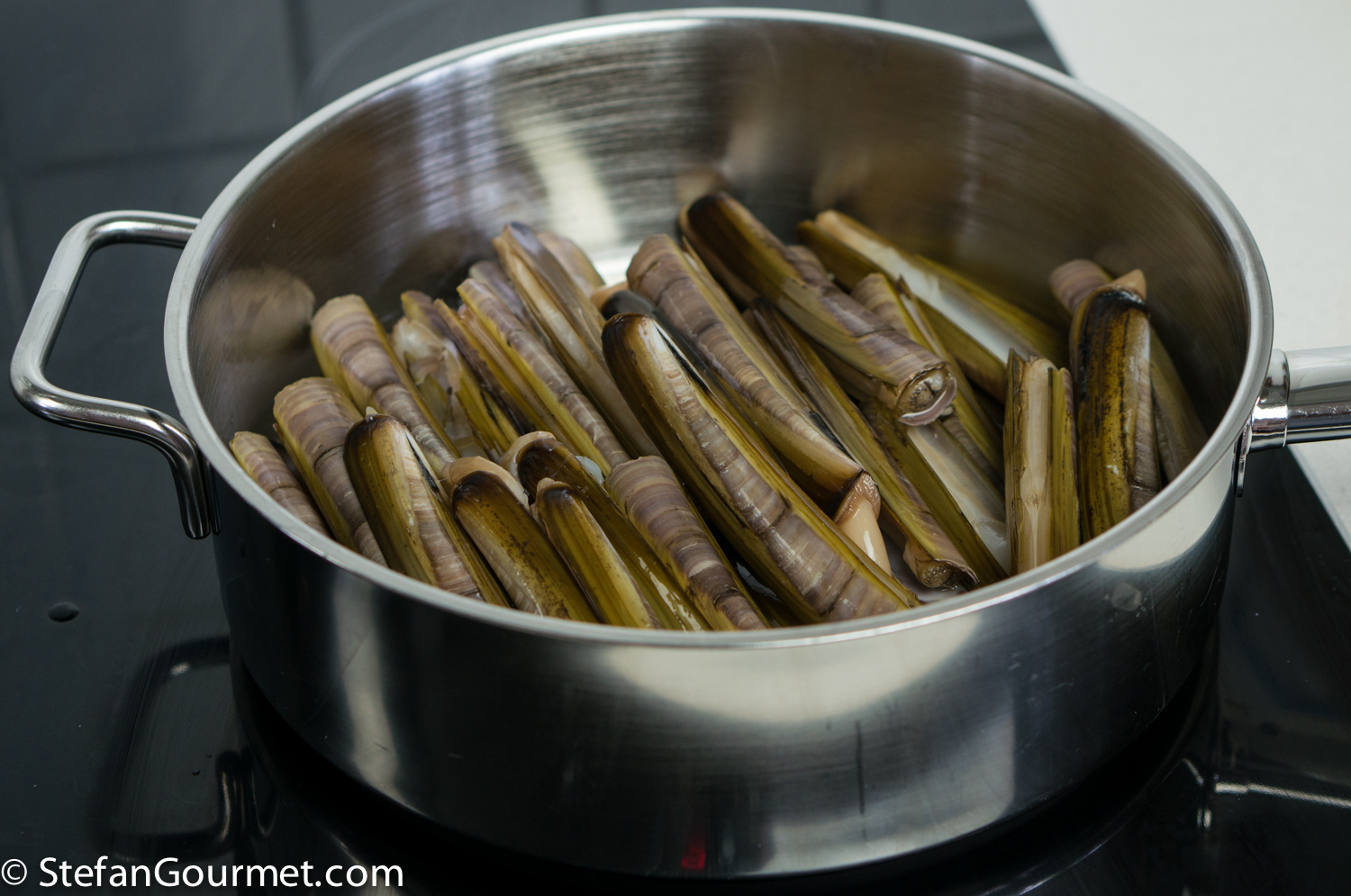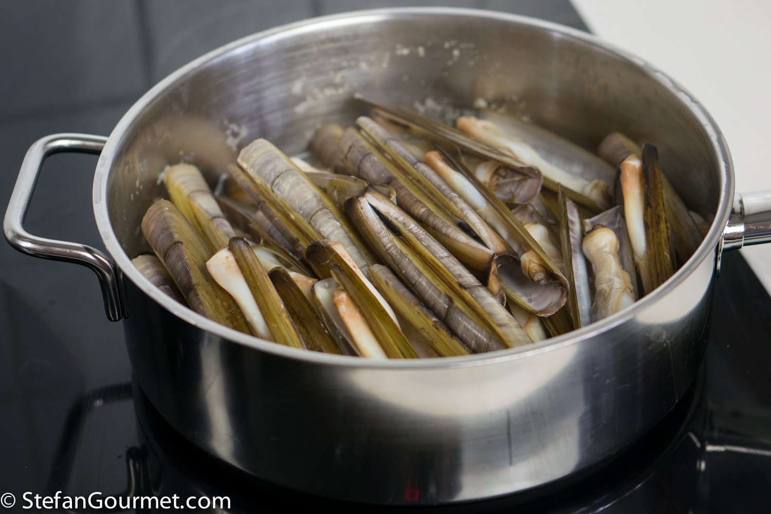 Put the razor clams in a wide pan with 120 ml (1/2 cup) dry white wine.