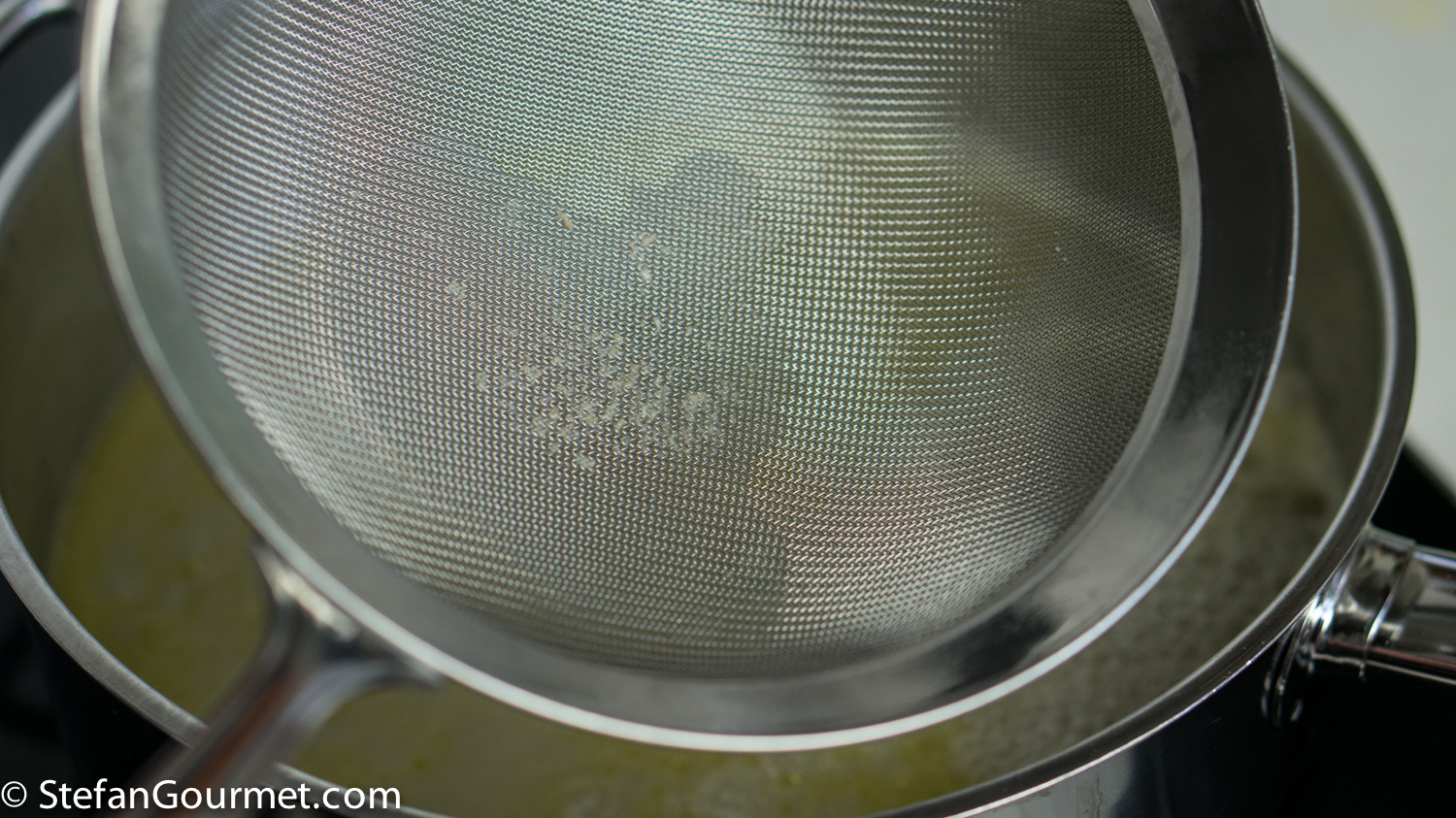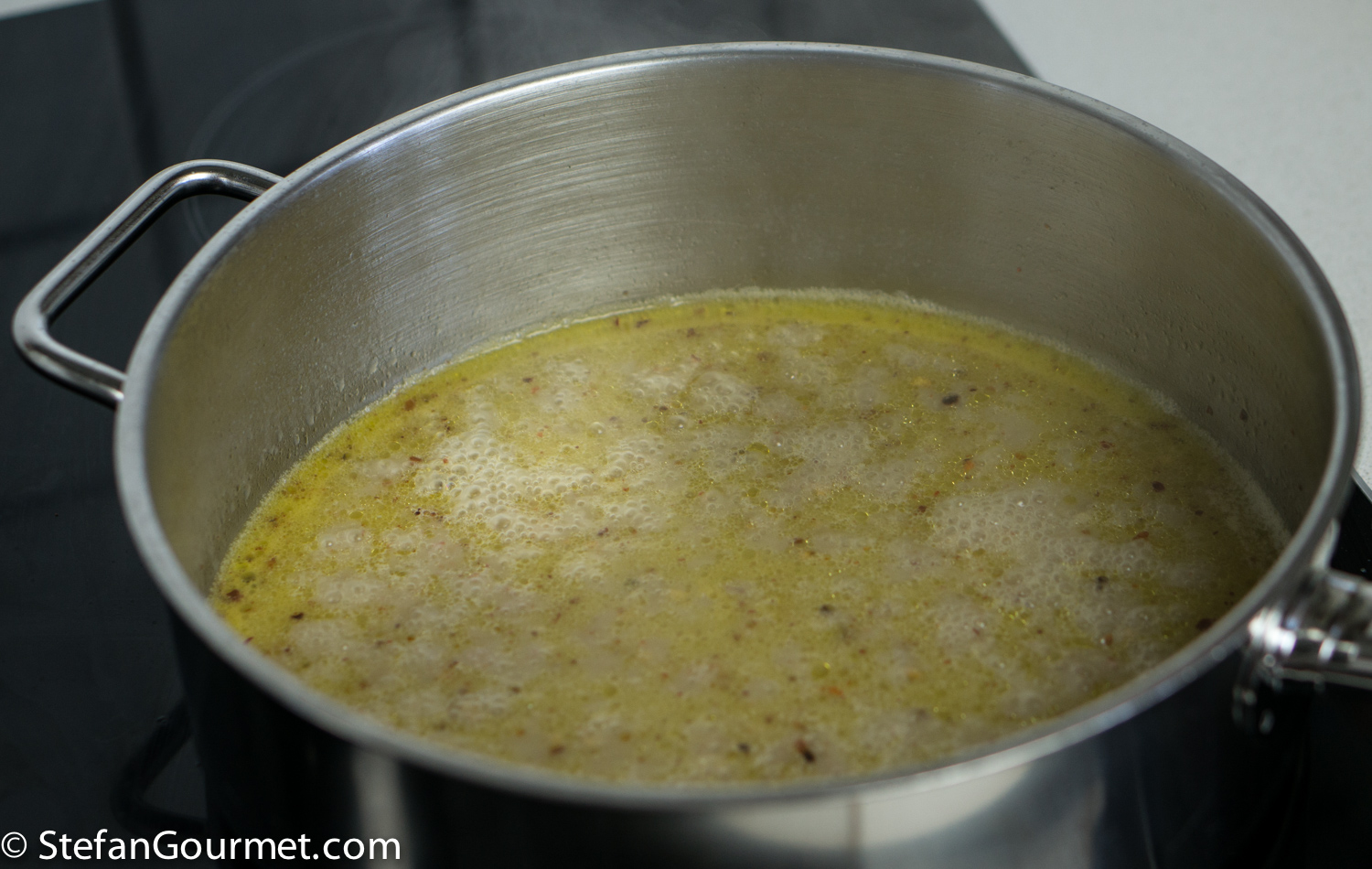 Filter the clam juice with a fine sieve and add to the garlic-flavored oil. Add chilli flakes to taste.