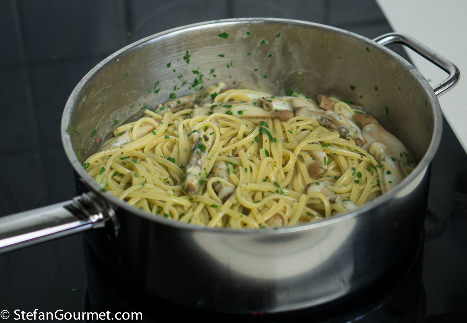 When the timer beeps, drain the linguine and add to the oil and clam juice, together with the reserved clams. Stir for a minute over medium heat to allow the clams to warm through and the sauce to thicken and to coat the pasta.
