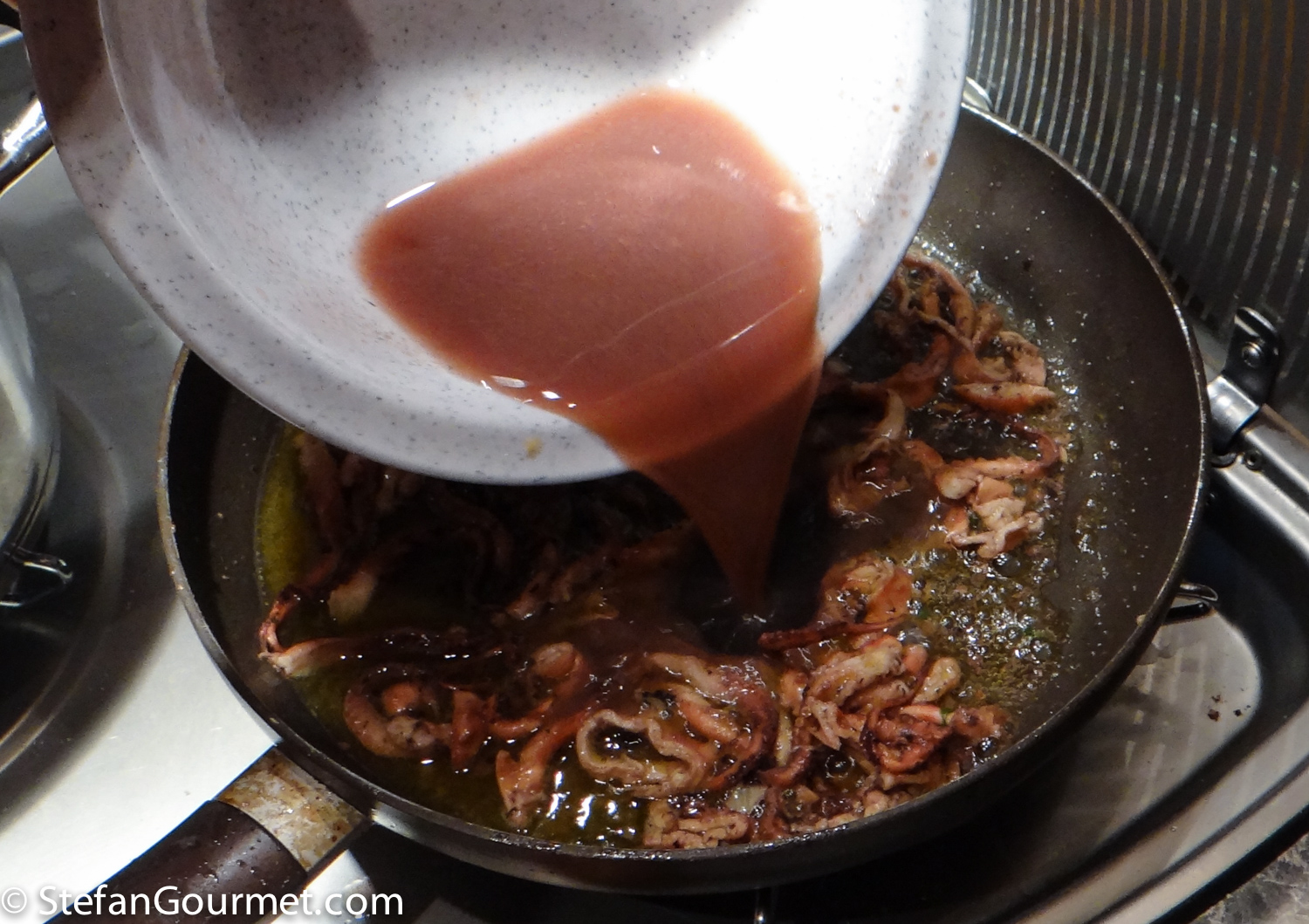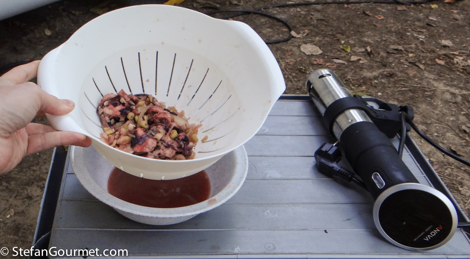 After cooking sous-vide, drain the octopus, and reserve the liquid.