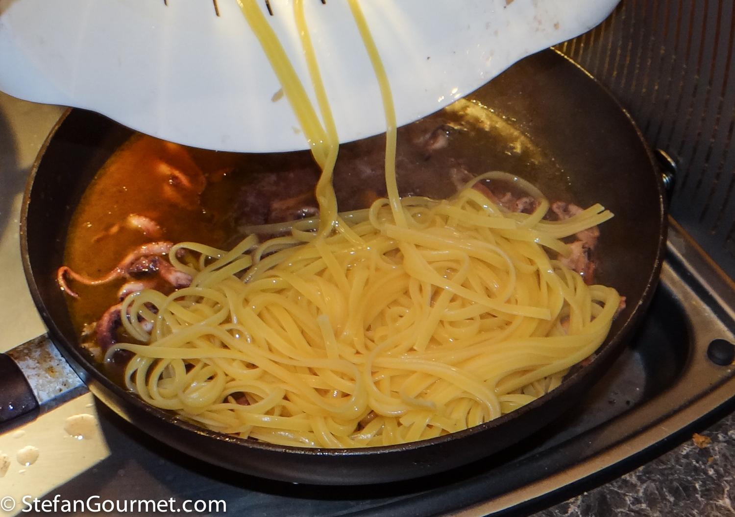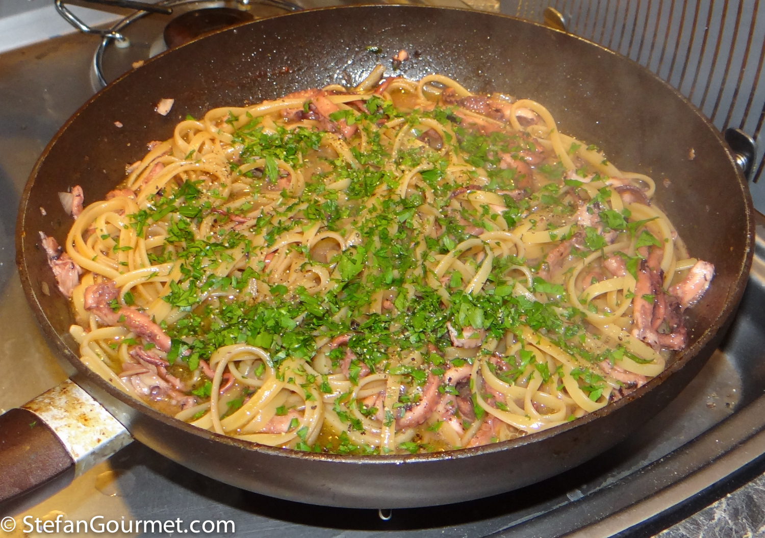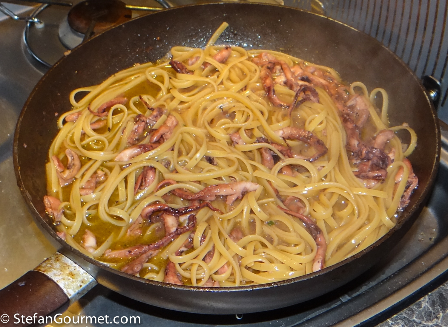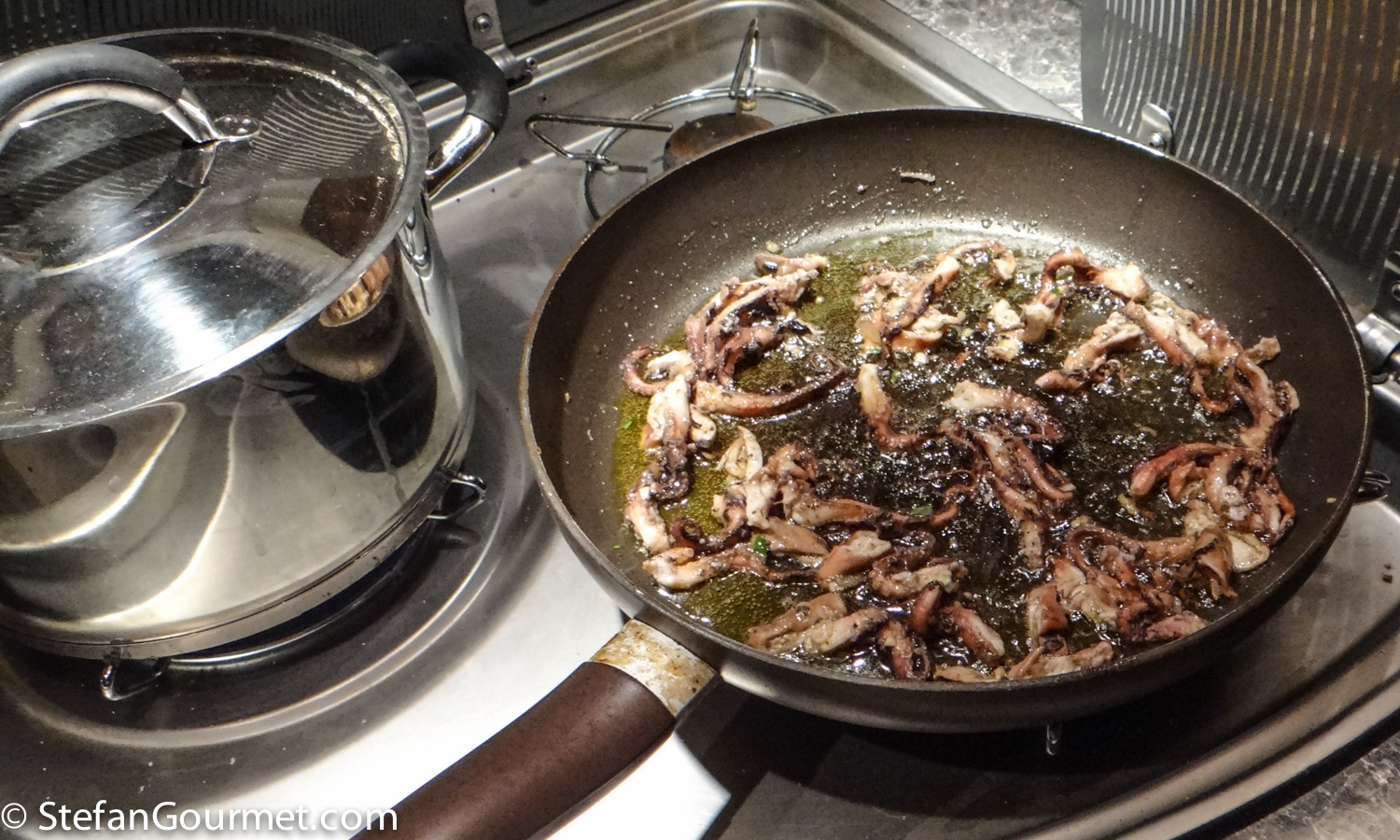 Bring a large pot of water to a boil. As the water used for cooking the moscardini was already almost at the boiling point, I used that water. The burners in an RV are very slow! Add salt and the linguine, and cook for about a minute less than the time indicated on the package for al dente. Meanwhile, chop the moscardini and sauté them in a frying pan in olive oil over high hea for a minute.