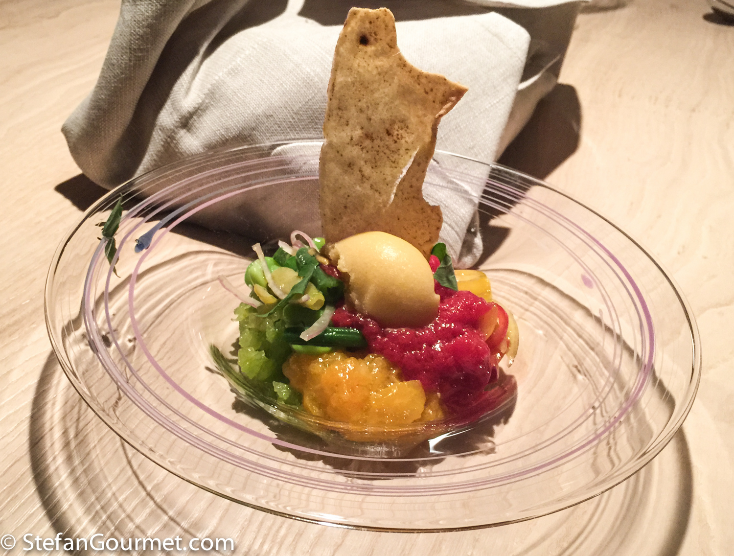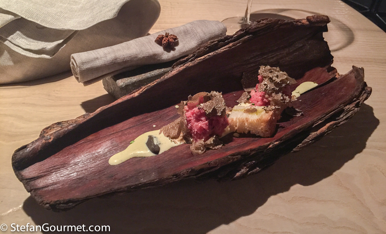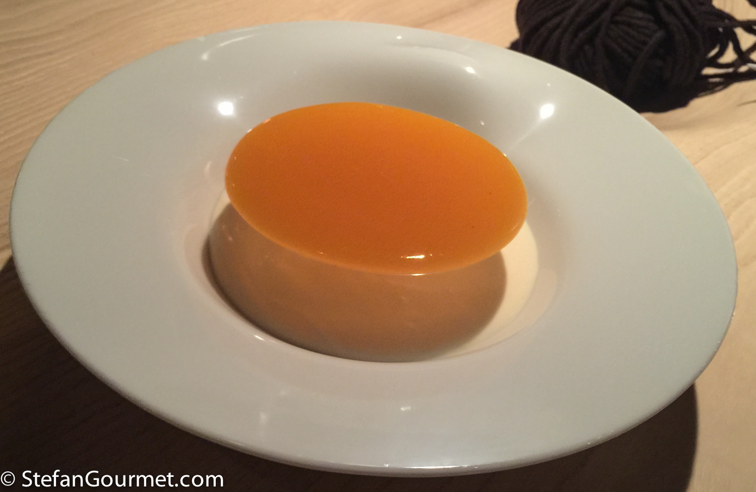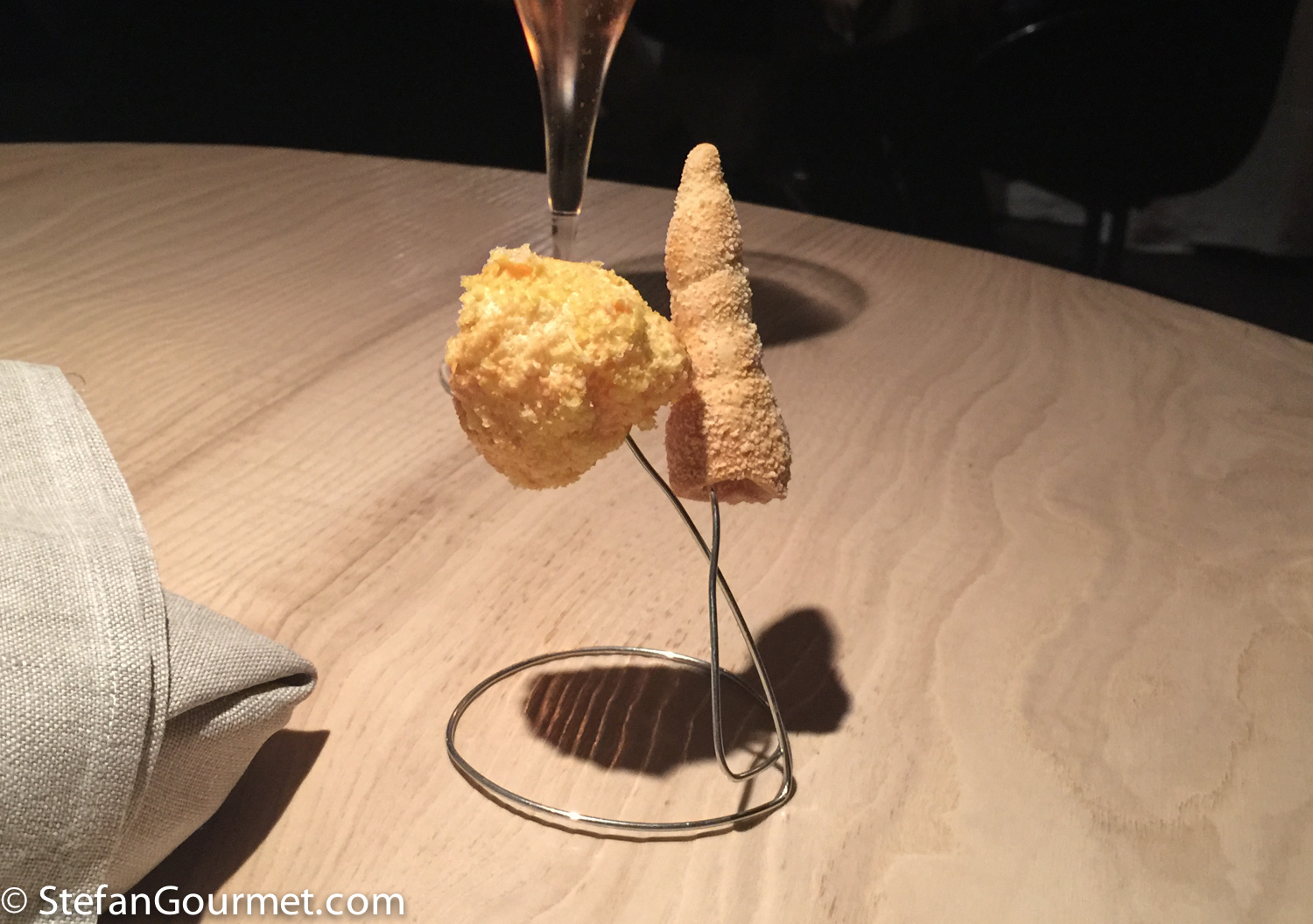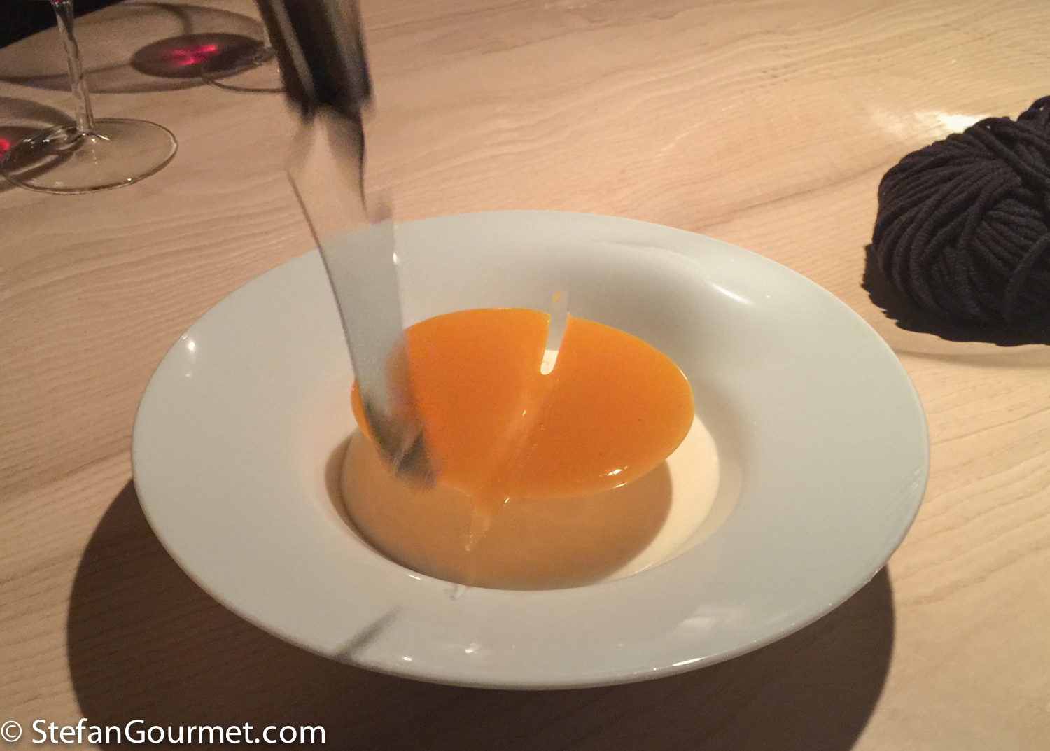 No table cloths in this three-star restaurant, but the natural look of wood instead with an indentation in the center of each table. Upon arrival, there is a ball of wool in the indentation on each table, which is soon replaced by the bread.