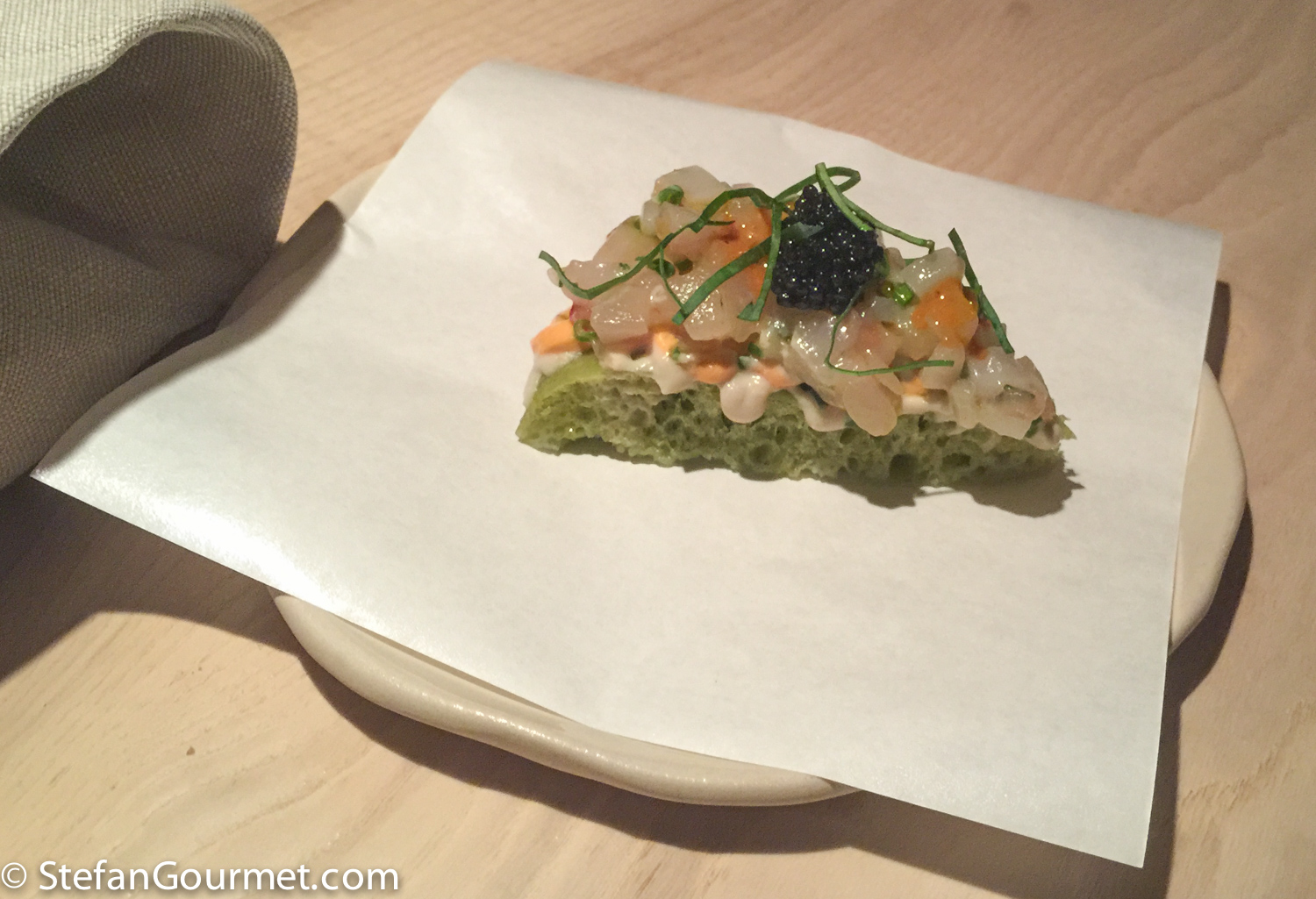Second course: “Pjzza di mare”. The crust of the ‘pizza’ was steamed and some green herbs (basil?) were mixed into the dough. The topping was raw seafood like scampi and caviar. Delicious.