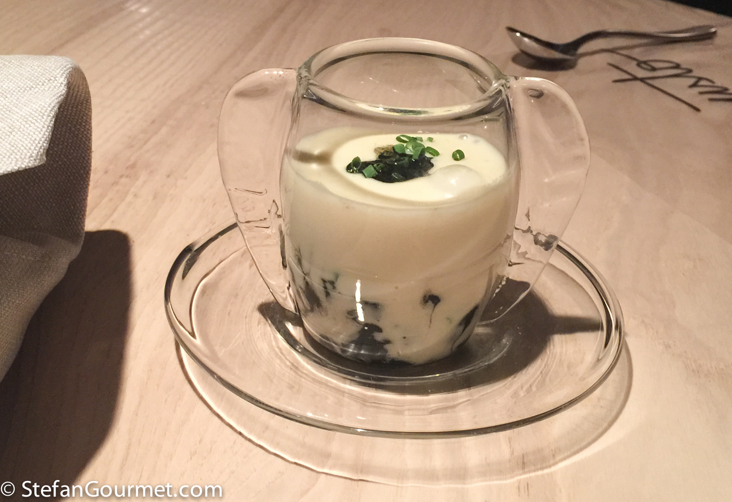 Third course: Cappuccino of squid with ink. Ink instead of coffee and potato mousse instead of milk foam, with slow-cooked very tender and flavorful squid on the bottom. Did OK with the same Viognier. 9/10
