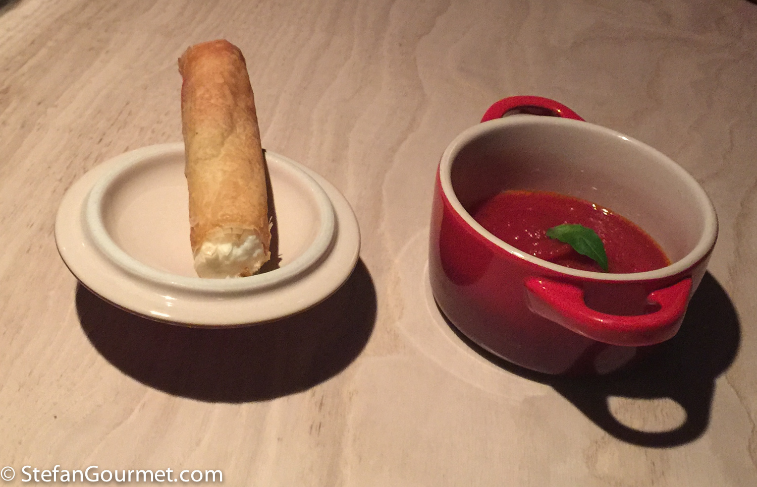 Fourth course: crispy cannellone with buffalo ricotta and mozzarella, and tomato puree. A very simple dish, executed perfectly with great flavor. Paired nicely with a Malvasia from Friuli. 9/10