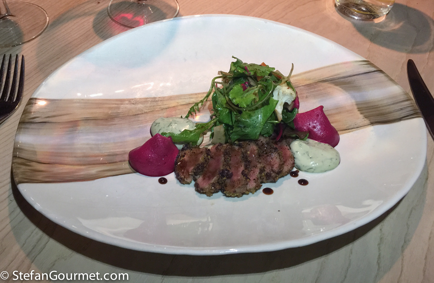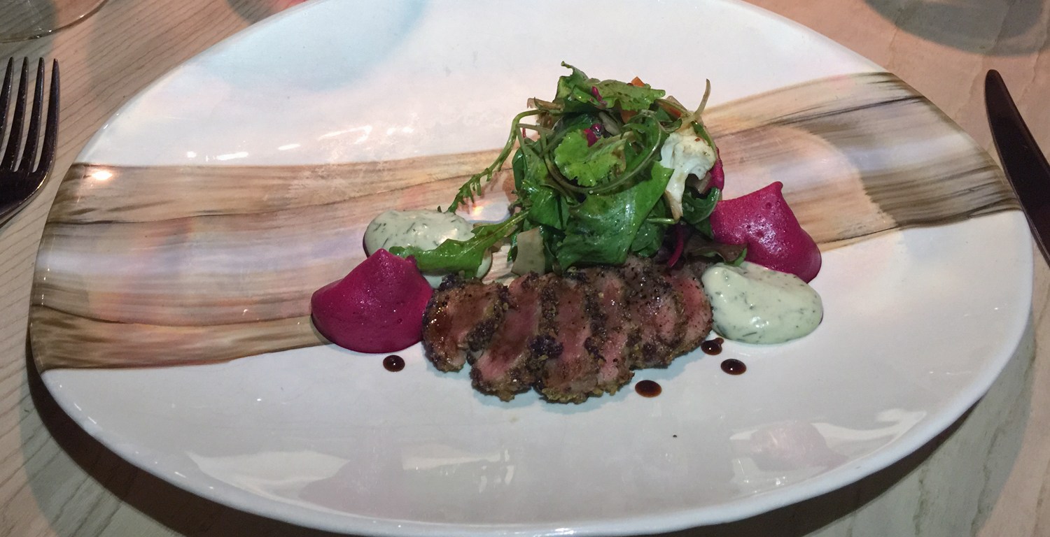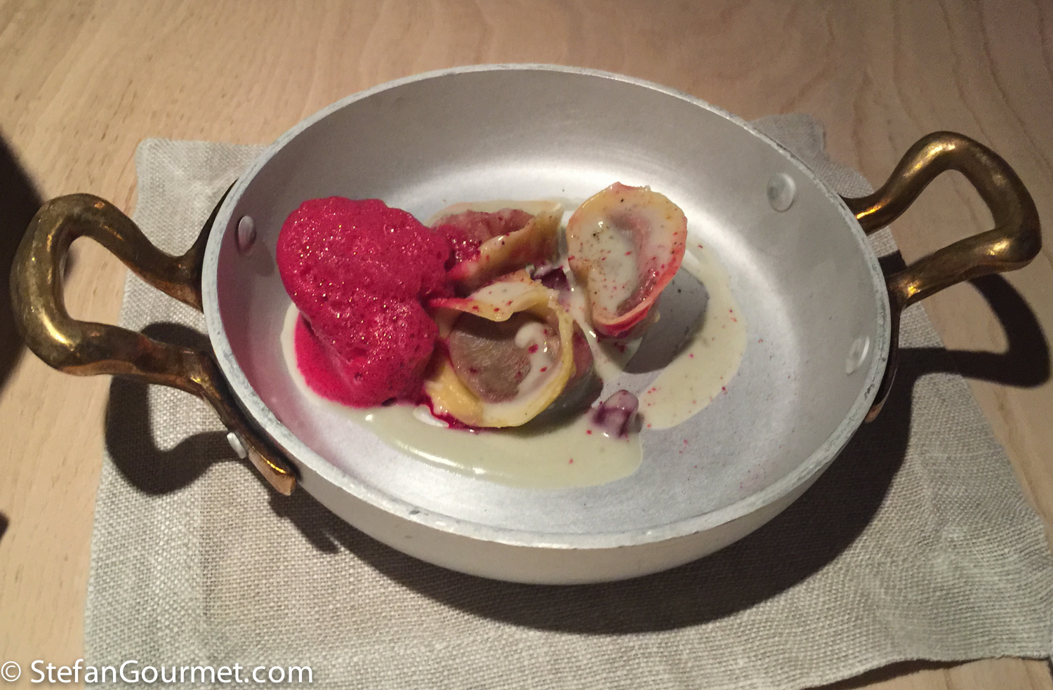 Fifth course: cappelli with beetroot and roquefort sauce and beetroot foam. The chef clearly loves beetroot, which was used in many dishes. Beetroot works nicely with blue cheese. The beetroot filling of the cappelli was liquid and had great beetroot flavor. This dish worked well with the Malvasia. 9/10