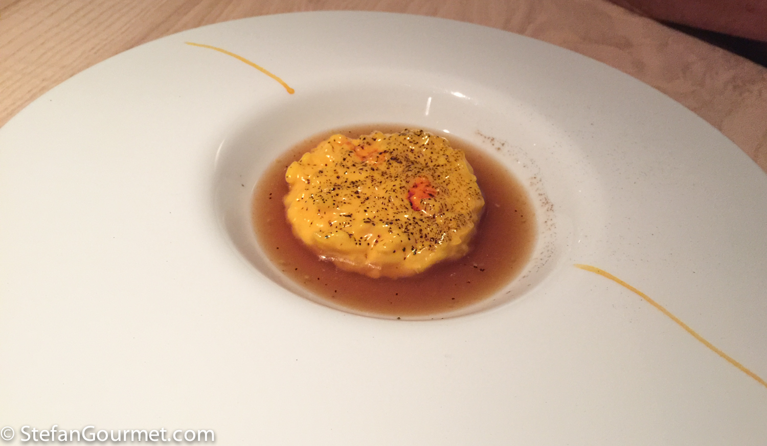 Sixth course: risotto with saffron, juniper berries, and licorice powder. This was served twice, first in the ‘classic way’…