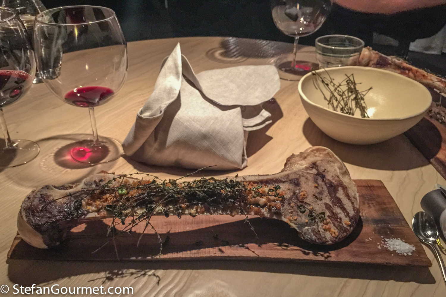 Eighth course: bone with herbs. The herbs (mostly thyme) was still smoldering when it was served. The bone marrow was topped with crunchy breadcrumbs. Wine pairing with a Bordeaux blend from Tuscany was OK. Although the way of serving this dish was very nice, we thought it was not as delicious as the other dishes. 8/10