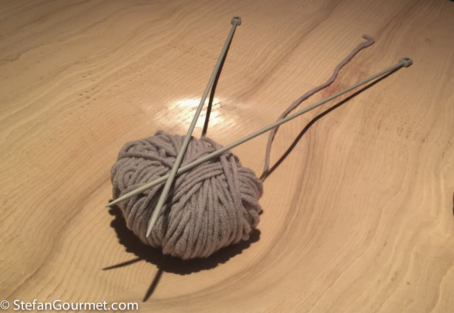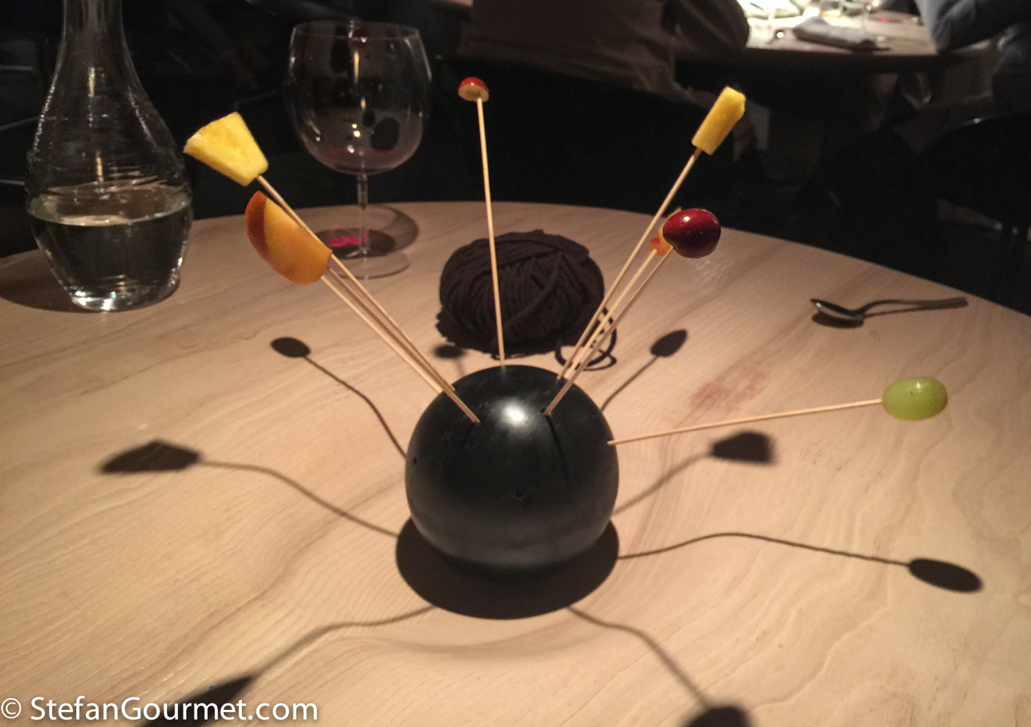 Because the bread had been cleared away, the ball of wool returned to the table. Kees being Kees started to use the skewers that were used to serve the fruit as knitting needles. The waitress saw this, asked “would you like some knitting needles”, and immediately brought them.