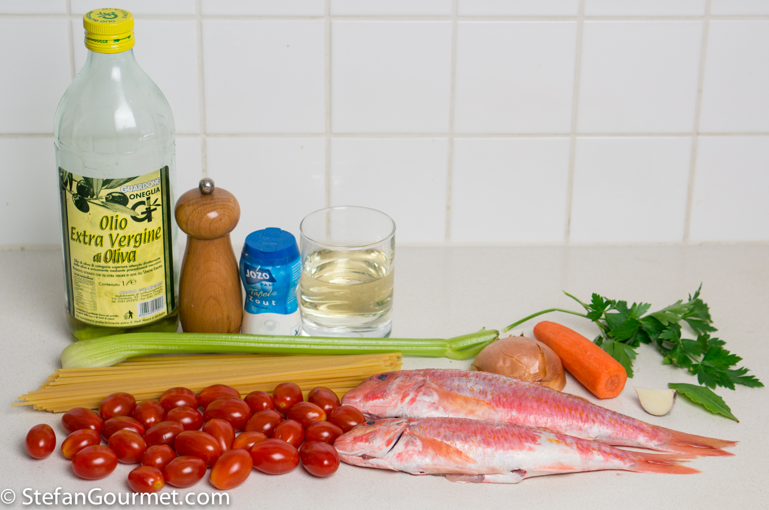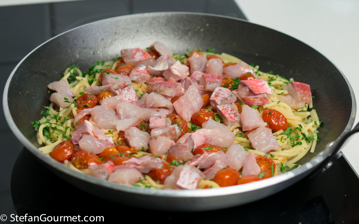 This photo shows what happened: the spaghetti broke up into short pieces. When I made the dish for the second time, I corrected my mistakes and used a better pan with great heat distribution, more stock in the beginning, and more gentle stirring. If you use enough stock and stir gently often enough, non-stick is not needed. I did not take photos of all the steps again, so for this post I ended up combining photos from the two sessions. That is what’s “fishy” about this post, other than the use of red mullet.