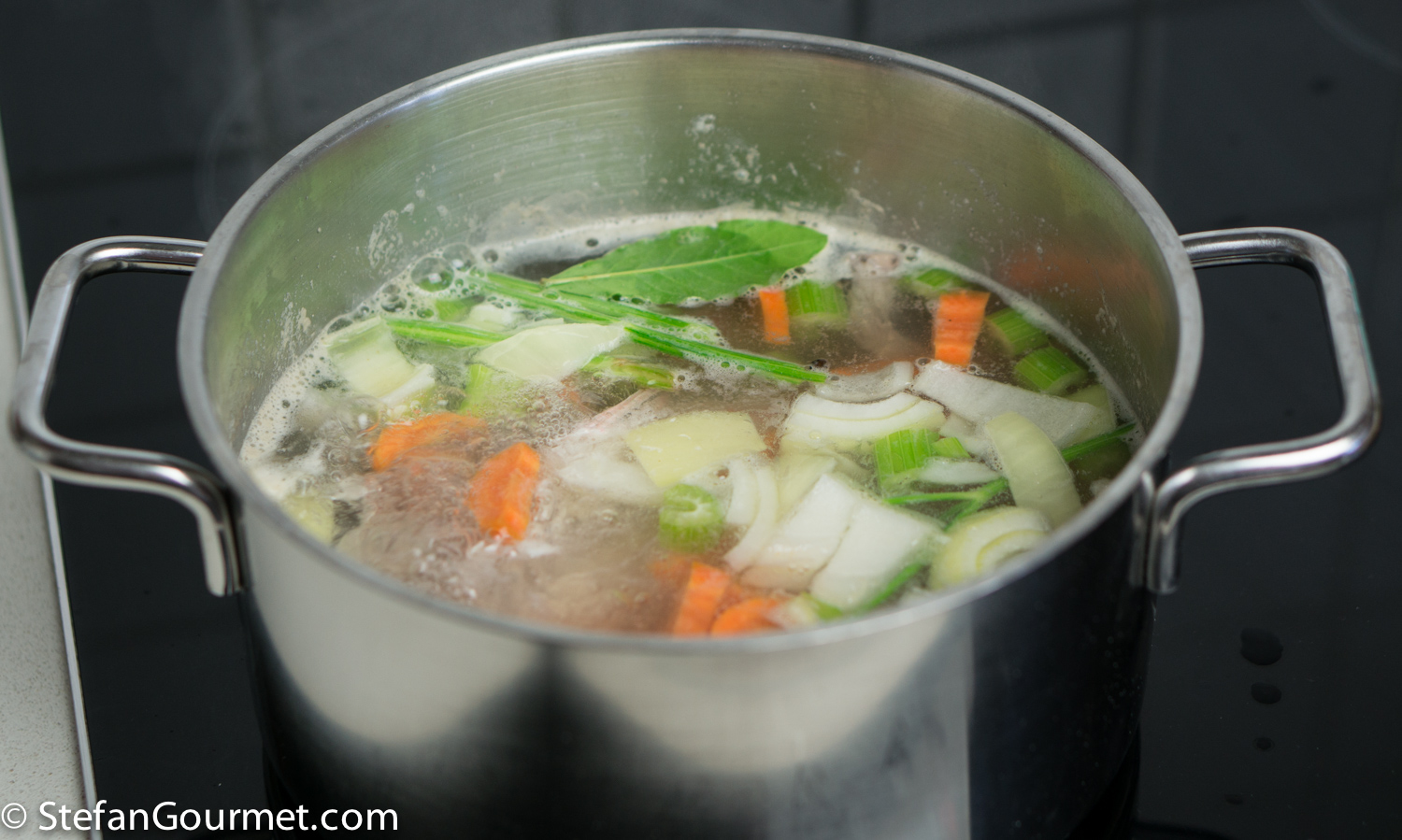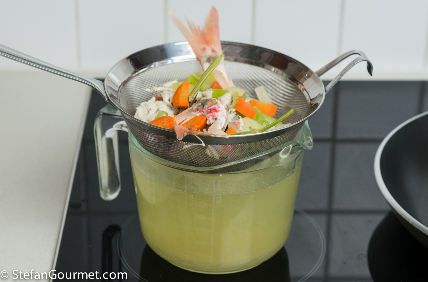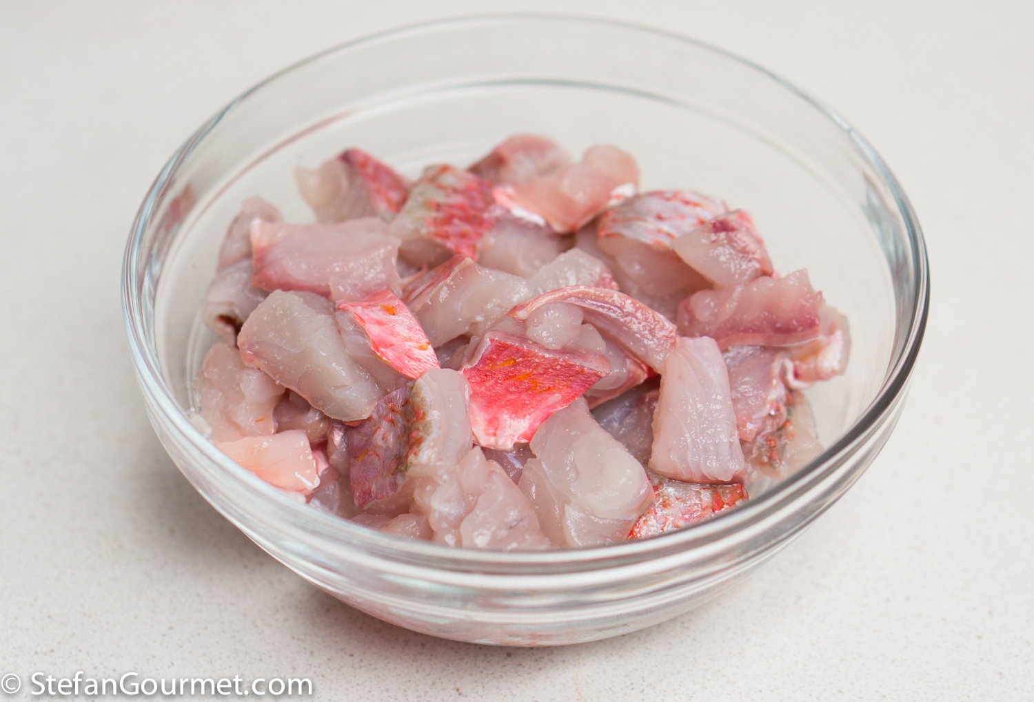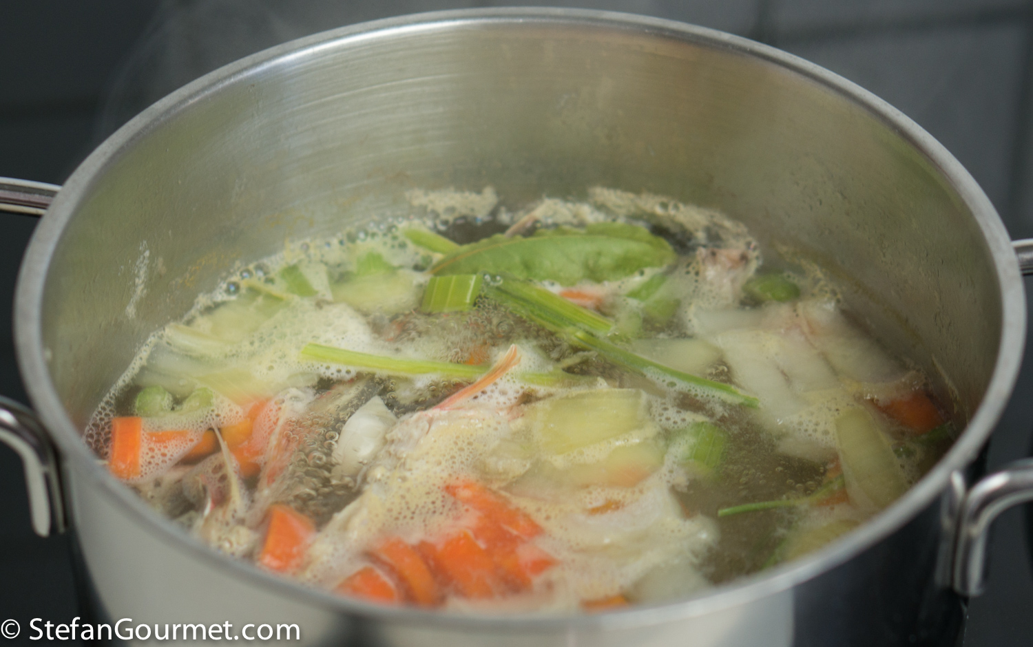 Start by making the fish stock. Soak the heads and bones in cold water to remove any traces of blood and ‘off’ odours. Then put the heads and bones in a pot and cover with a litre (quart) of cold water.