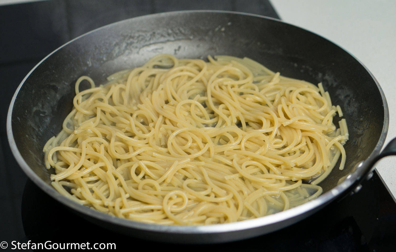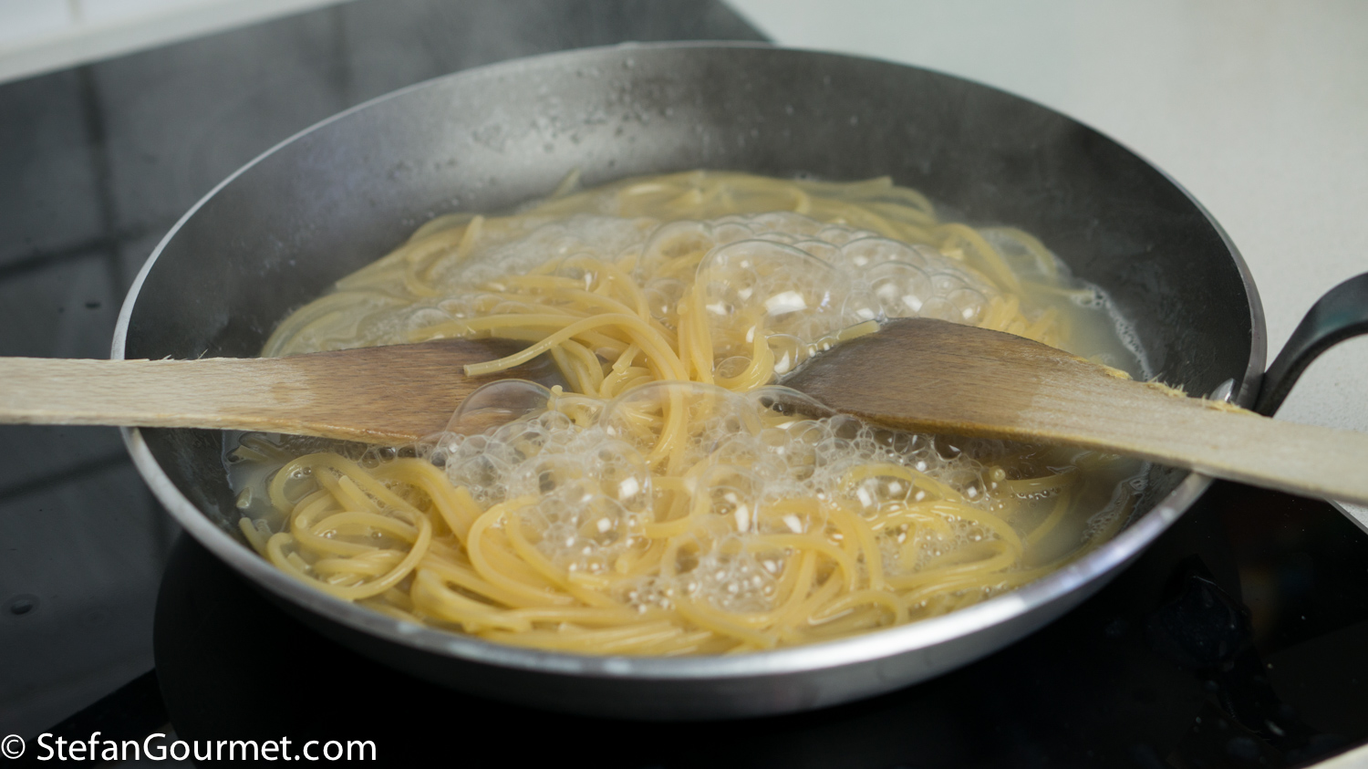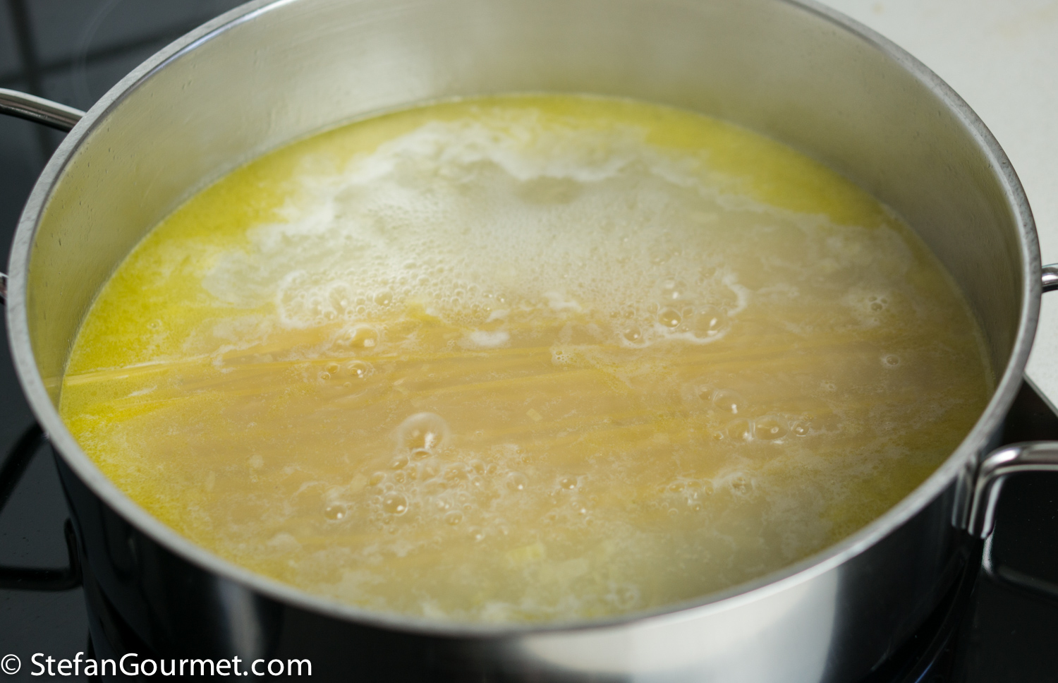 It is also a bit more difficult to get it right. Especially when using “long” pasta like spaghetti, you need to use a wide thick-bottomed pan with good heat distribution, and you should start with a generous amount of stock. Once the pasta has become flexible, the amount of stock in which it cooks can be less. Otherwise, the pasta will break into small pieces and you won’t be able to roll it around your fork. (I hope you are not one of those people who cuts spaghetti into small pieces and then eats it with a spoon! Spaghetti is eaten with a fork only. In Italy, restaurants won’t even serve a knife or a spoon with a plate of spaghetti. Just a fork.)
