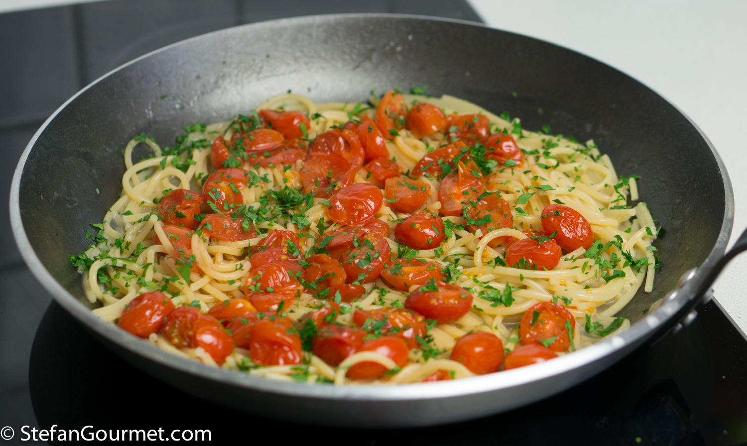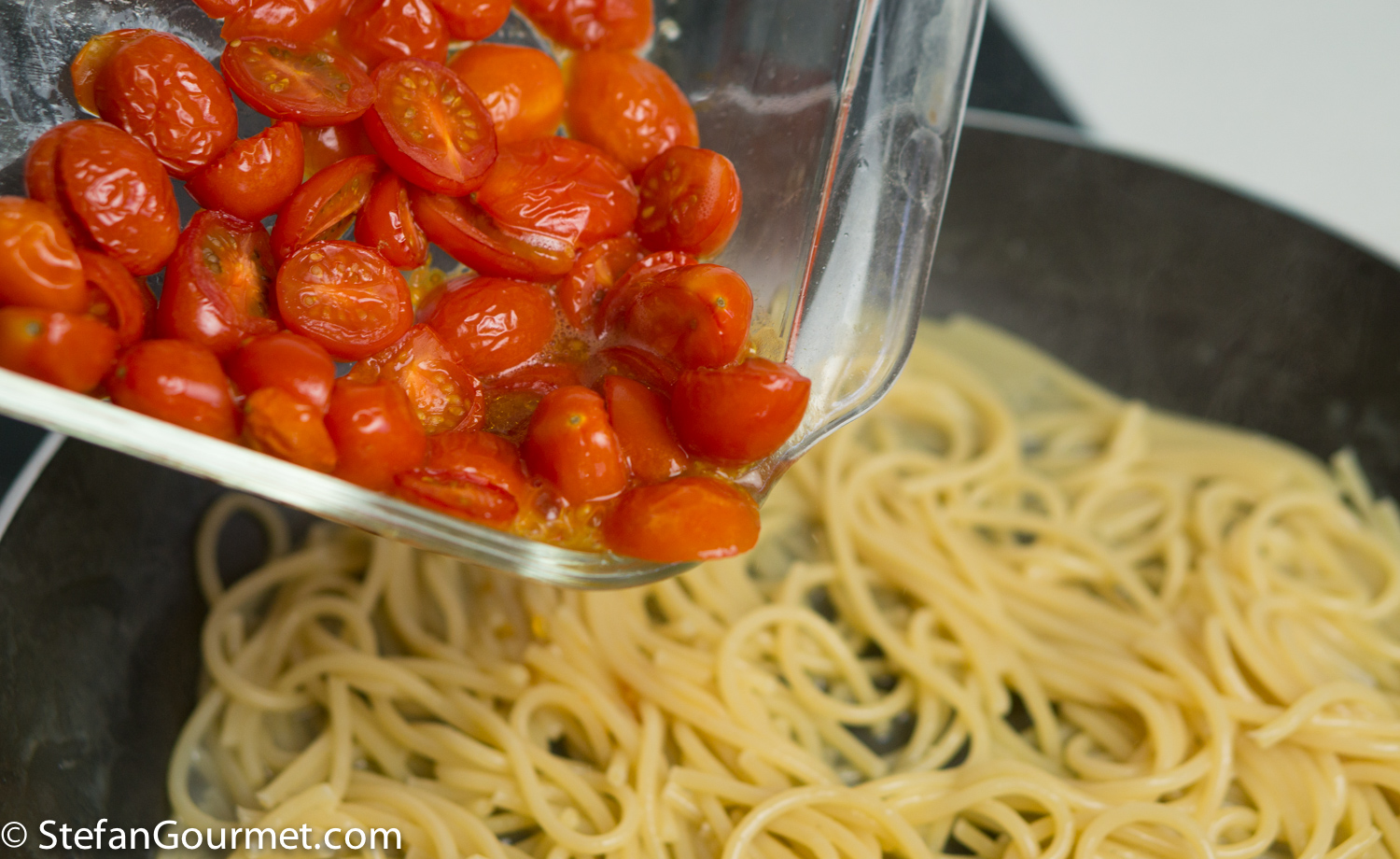 Once the spaghetti is almost cooked, add the baked cherry tomatoes including the juices from the oven dish.