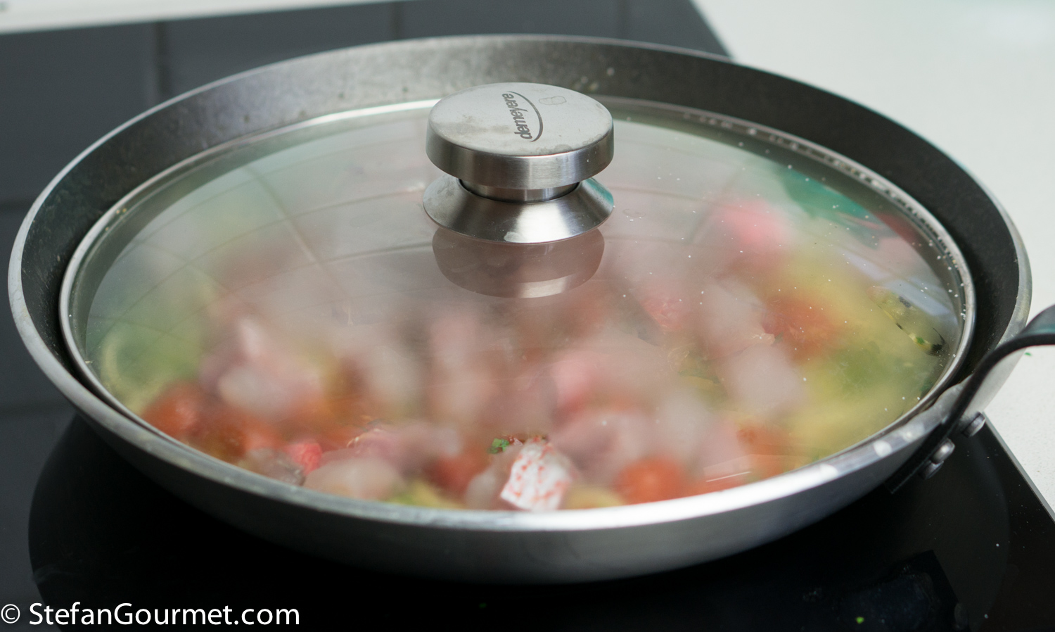 Once the fish has turned white, it is cooked. Stir very gently so the fish and the tomatoes will stay in tact. Season to taste with salt and freshly ground black pepper.