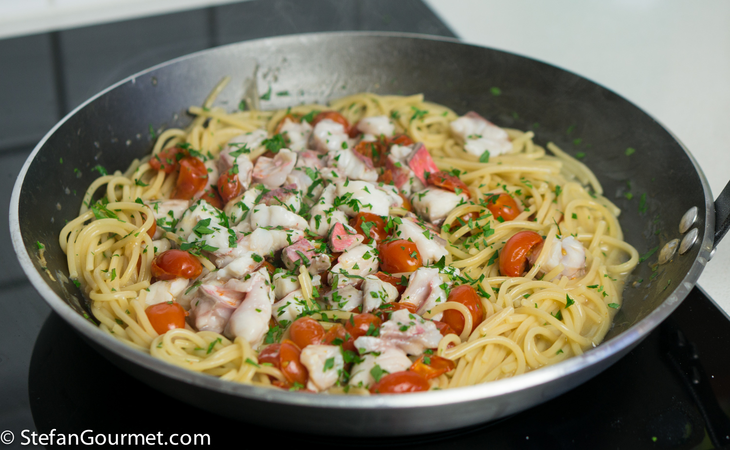 To try the technique of spaghetti risottati, I prepared an adapted version of Spaghetti all’Aqua Pazza, spaghetti with fish and tomatoes. The main differences are that more stock is needed, and that the pasta is cooked only in the stock. The result was very nice, with a creamier sauce and a stronger flavor from the fish stock.