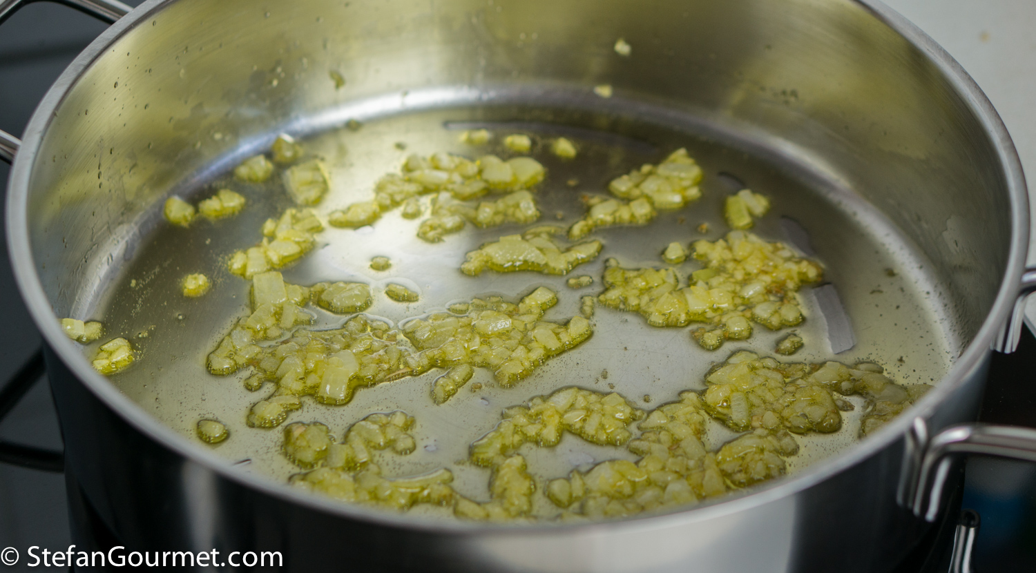 If you paid close attention to the photos, you probably noticed that I used two different pans. The photos start with a silver-colored pan, and end with a black non-stick pan. This is because my first attempt at making this dish, in a non-stick pan, didn’t go so well. I did not add enough stock in the beginning and the heat distribution of the pan was not good enough, so I had to use high heat and a lot of stirring to keep it boiling.