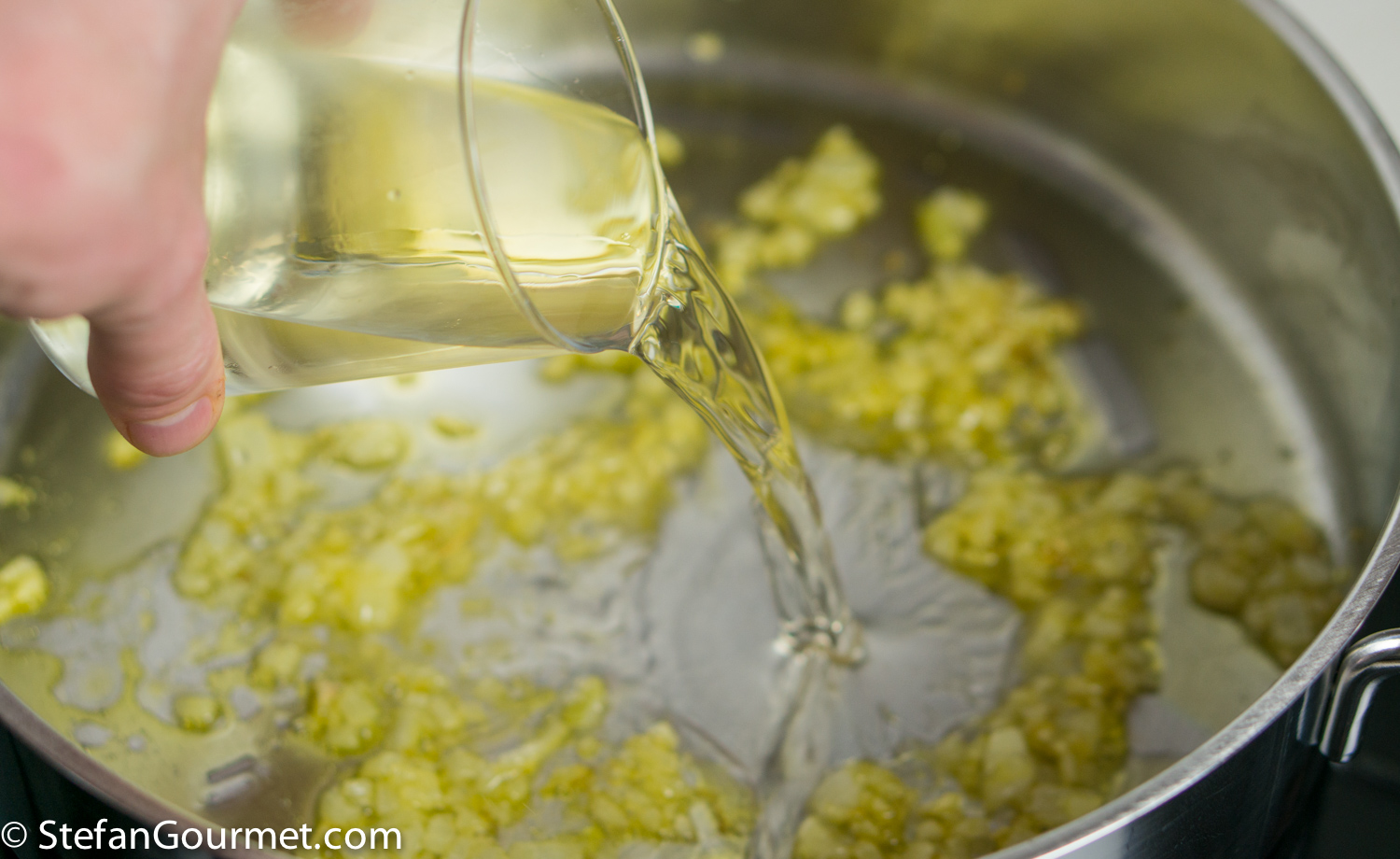 Add about half a liter (2 cups) of the fish stock and bring to a boil. Season with salt.