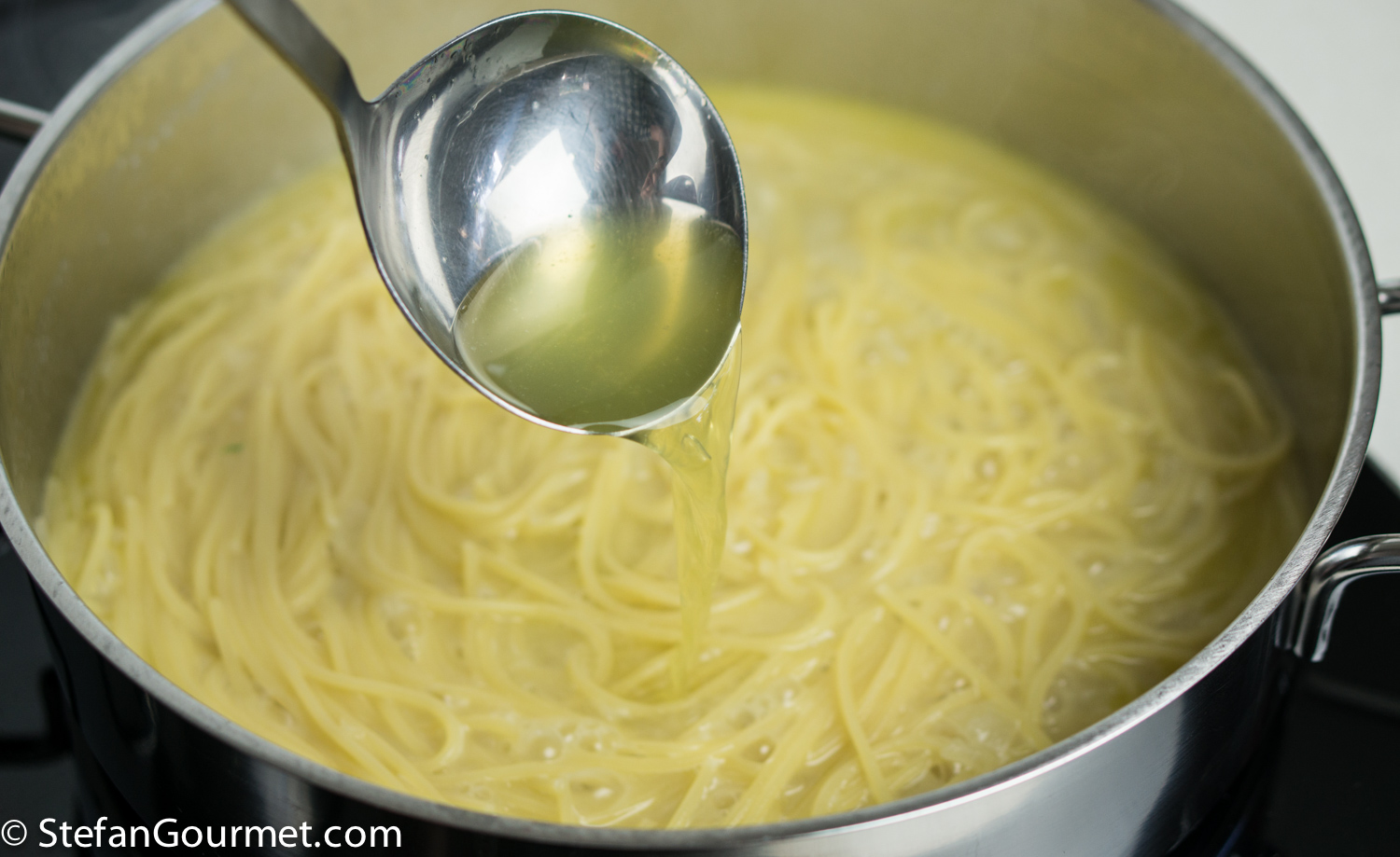 A technique that takes finishing cooking the pasta in the sauce one step further, is pasta “risottata”, or pasta cooked in the way of risotto. This means that the pasta is cooked in stock from the start, and more stock is added as needed during the cooking process. My blogging friend Bea is an advocate of this technique, and she published many recipes that use it on her blog Viaggiando con Bea. It has the same advantages of finishing to cook the pasta in the sauce, but it makes the sauce more creamy and the flavors marry even more.