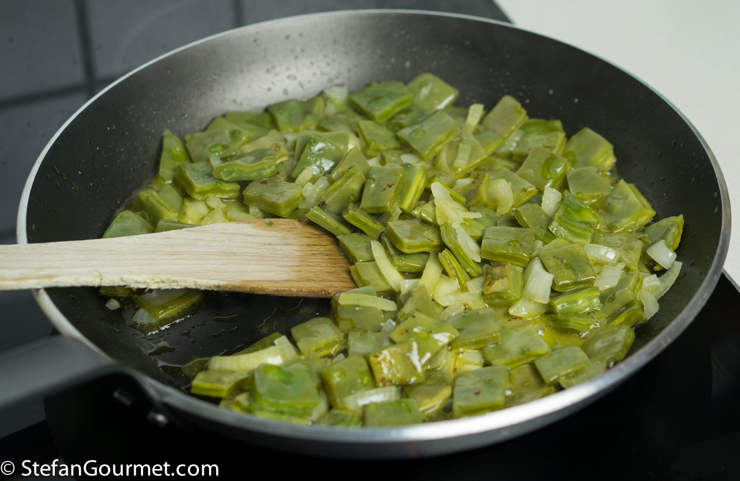 Sauté the cactus paddles with onion in the olive oil over medium high heat for a couple of minutes.