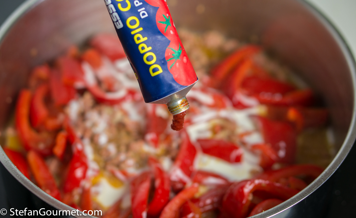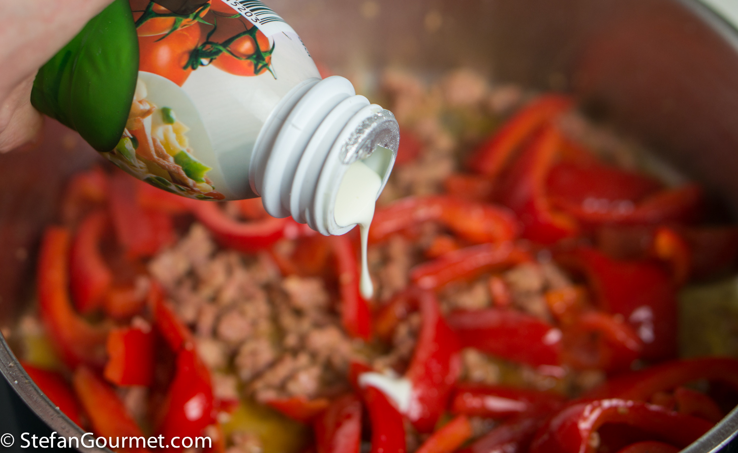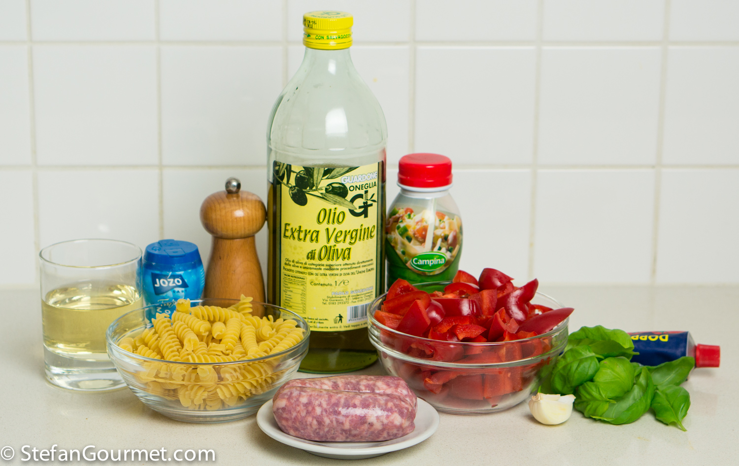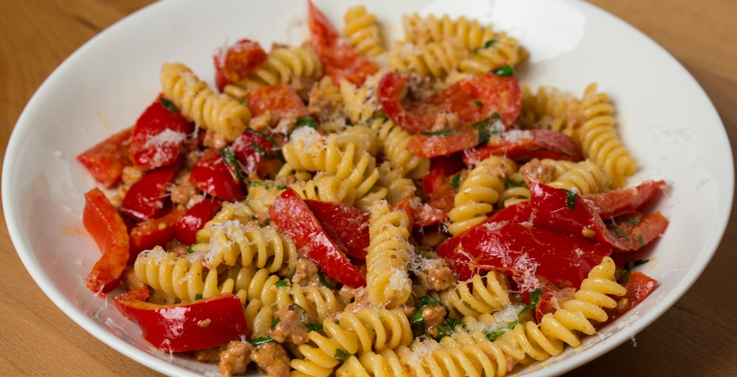 The combination of sweet Italian sausage with bell peppers works very well. Especially with some additional depth of flavor added by white wine, basil, cream, and tomato paste. The cream is important as it rounds out the tartness of the peppers, sausage, tomato, and wine.