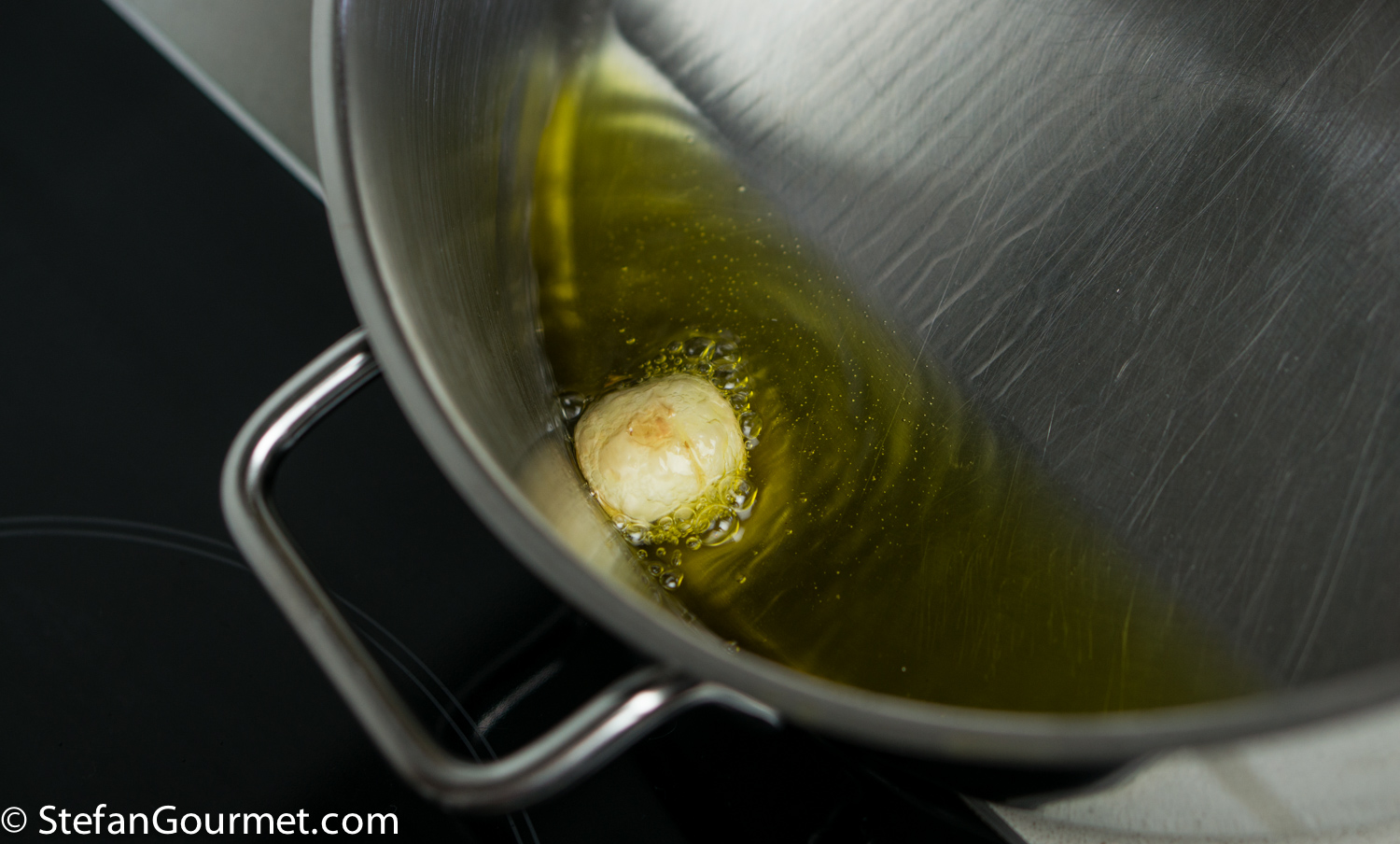 Bring a pot of water to a boil for the pasta. Meanwhile, heat 2 Tbsp olive oil in a frying pan. When the oil is hot, tilt the pan and fry a whole garlic clove until it is golden in the oil to flavor it. Once it is golden, discard the garlic clove.