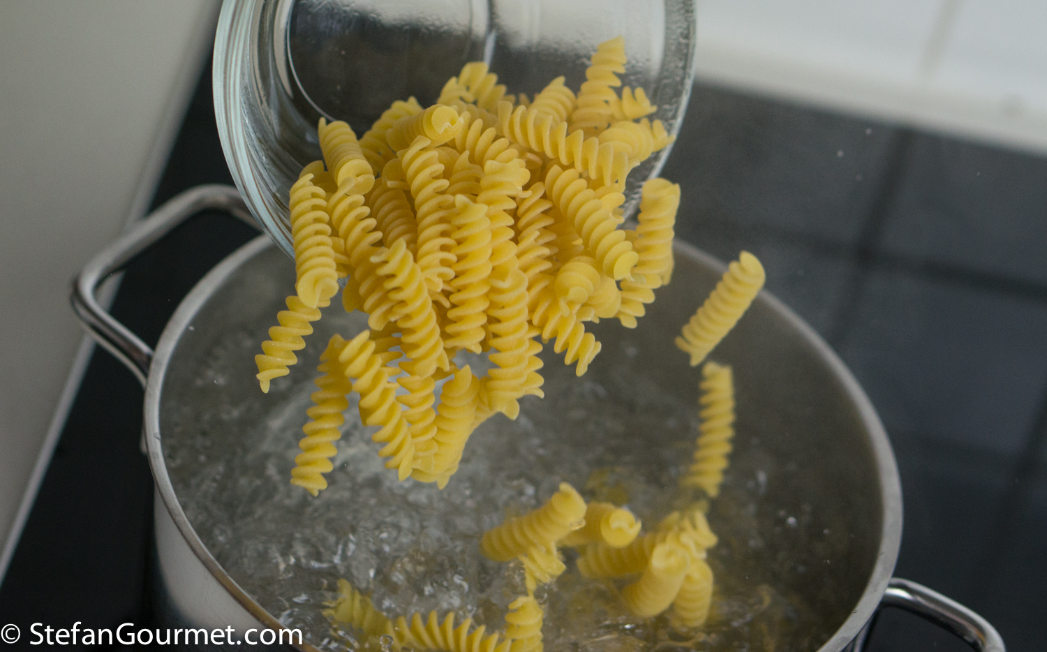 When the water boils, add about a tablespoon of salt and 150 grams (.33 lb) of fusilli.