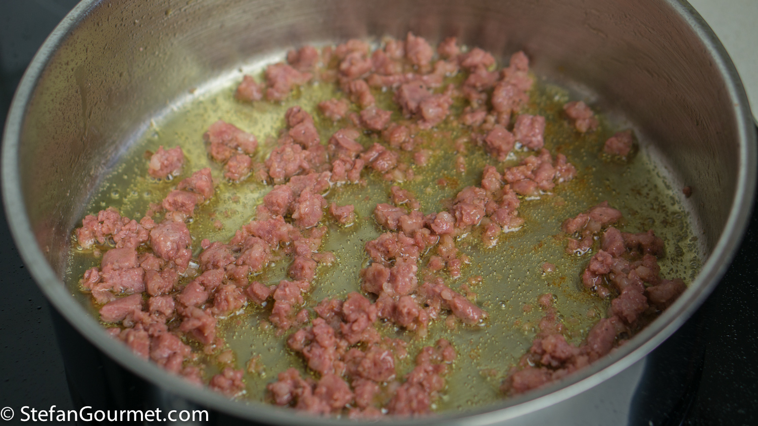 Add 150 grams (.33 lb) sausage meat to the garlic-infused oil.