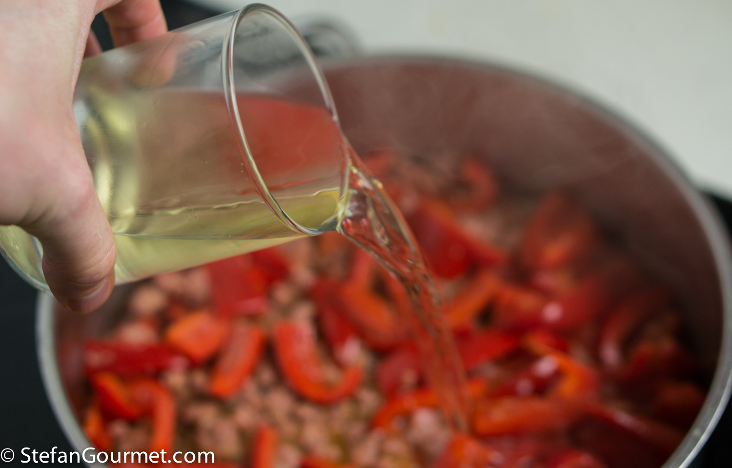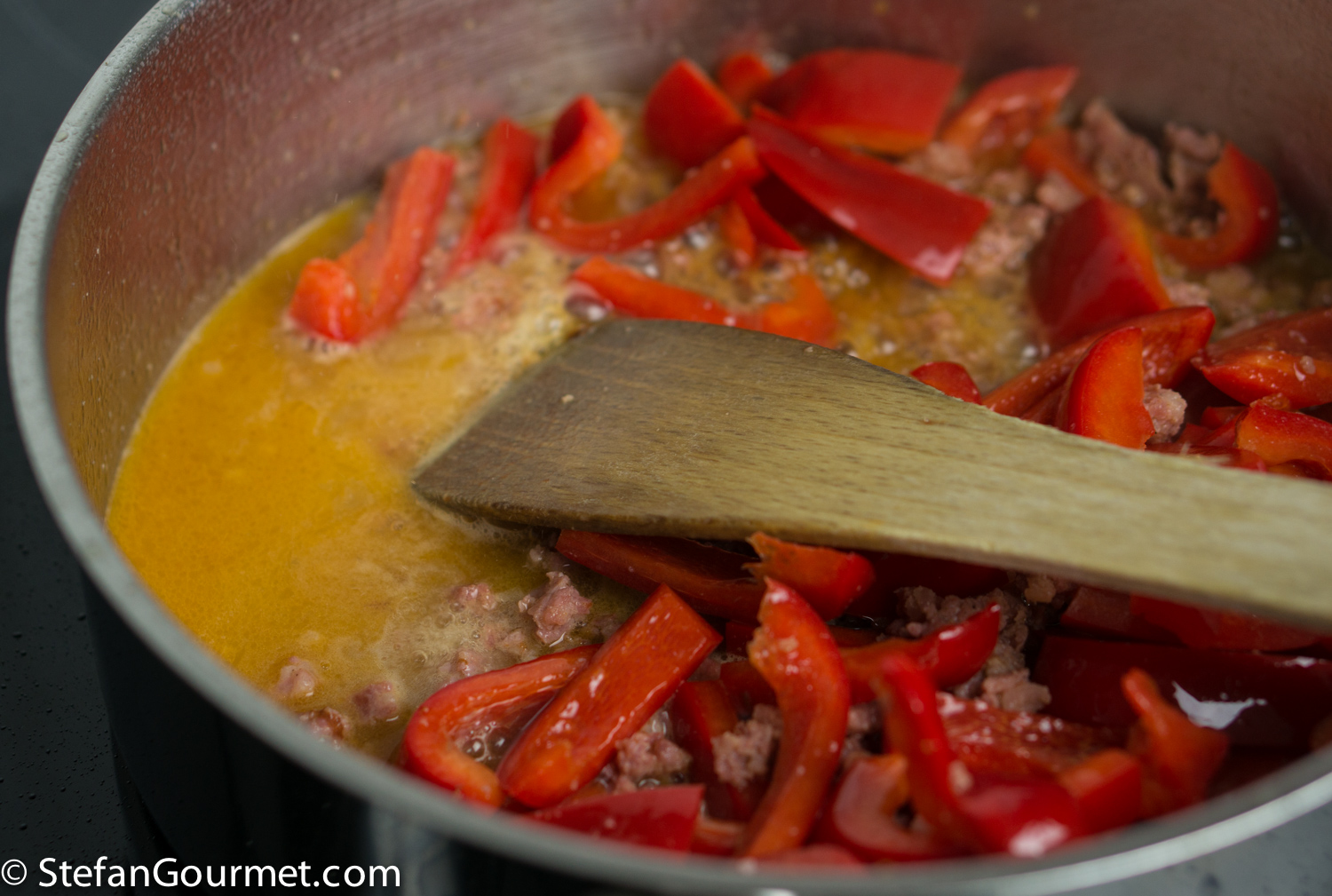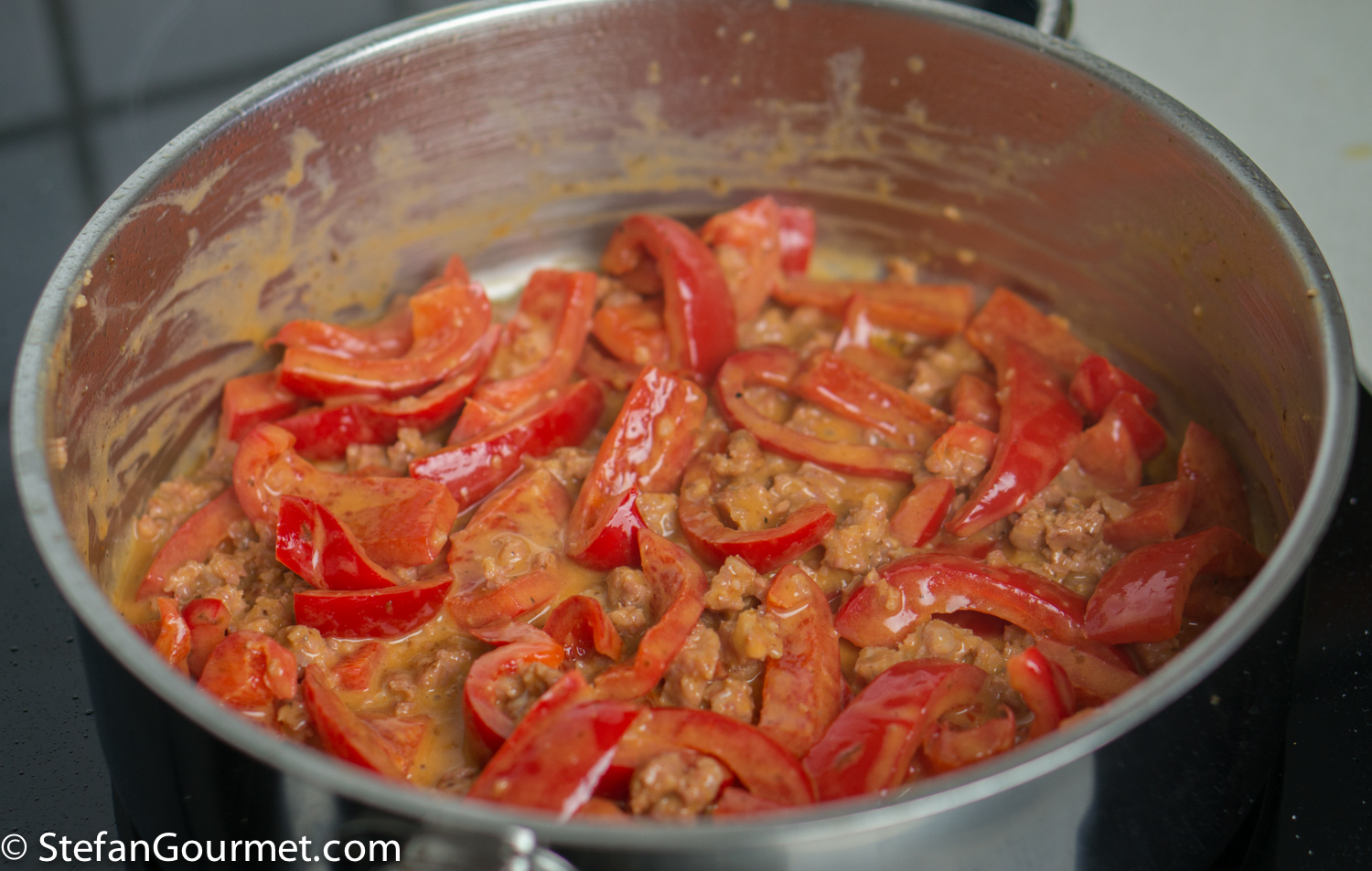 Add 2 red bell peppers cut into strips, and stir for a minute.
