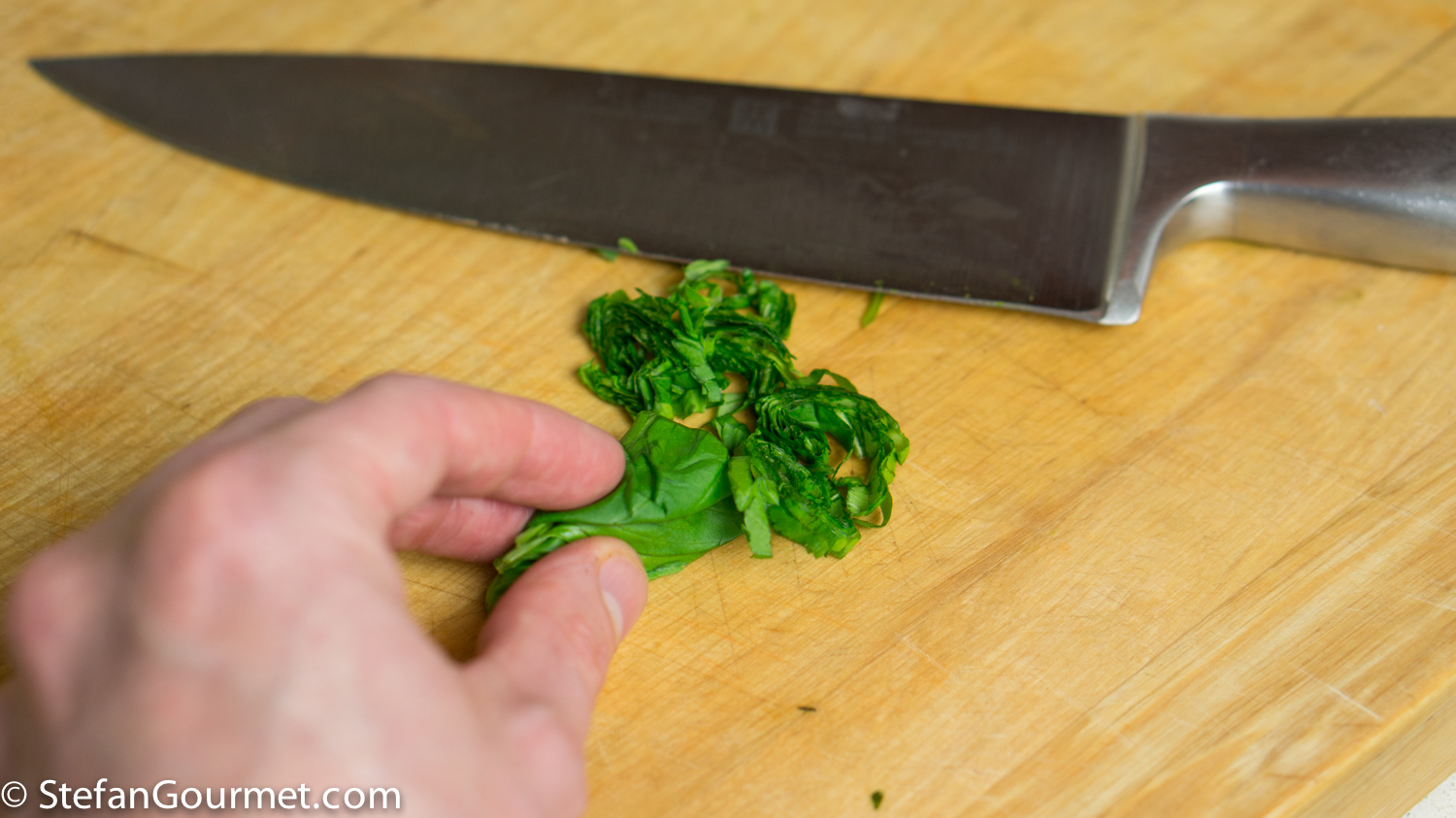 Cut a handful of basil leaves into thin strips by first stacking the leaves, then rolling them up, and cutting them with a sharp knife. This technique is called “chiffonade”. It is better for the flavor than mincing the basil, because the basil won’t oxidize as much. For even better results, tear the basil with your hands into small pieces (but that would take more time). Aim at ending up with about a tablespoon of basil strips.