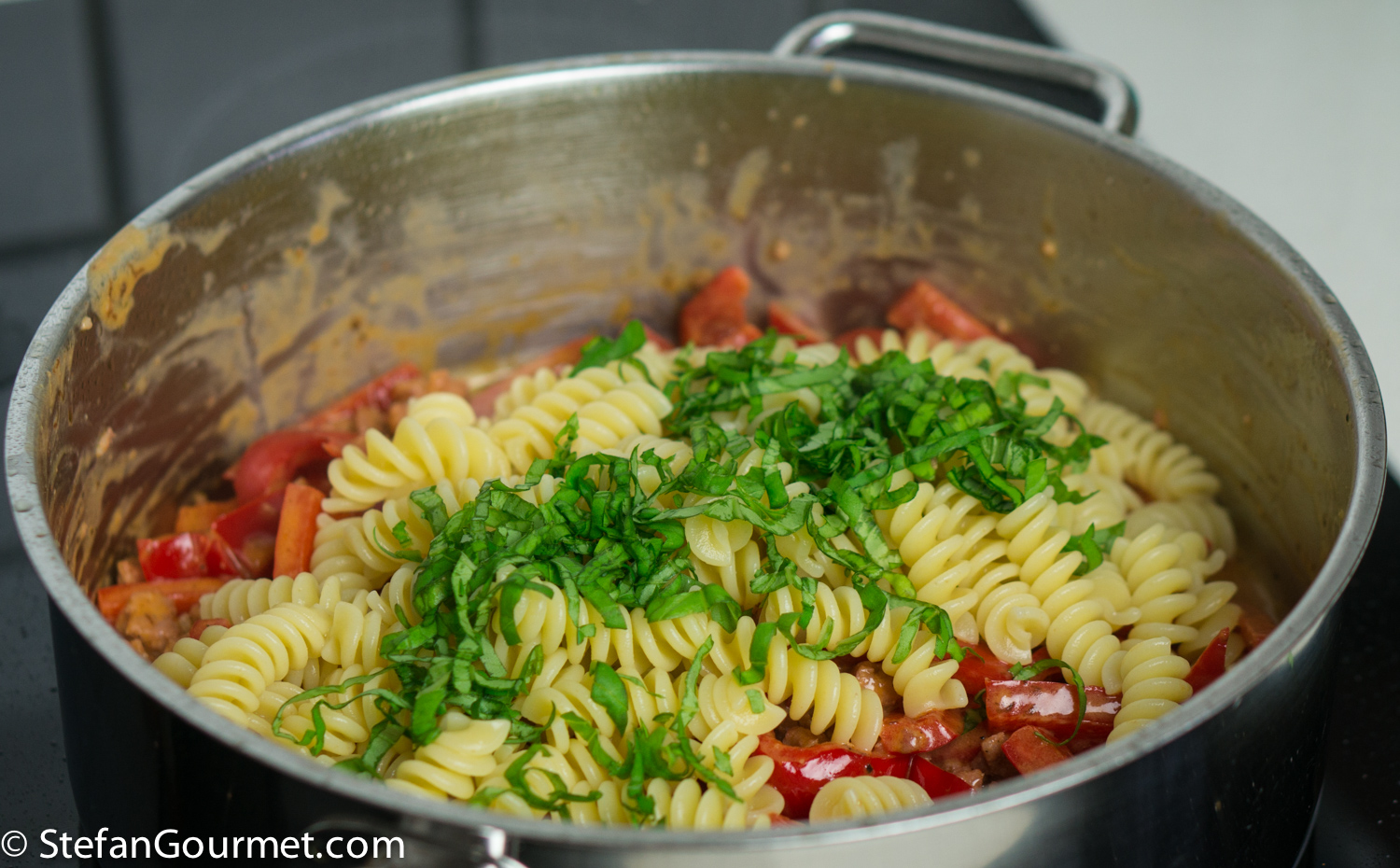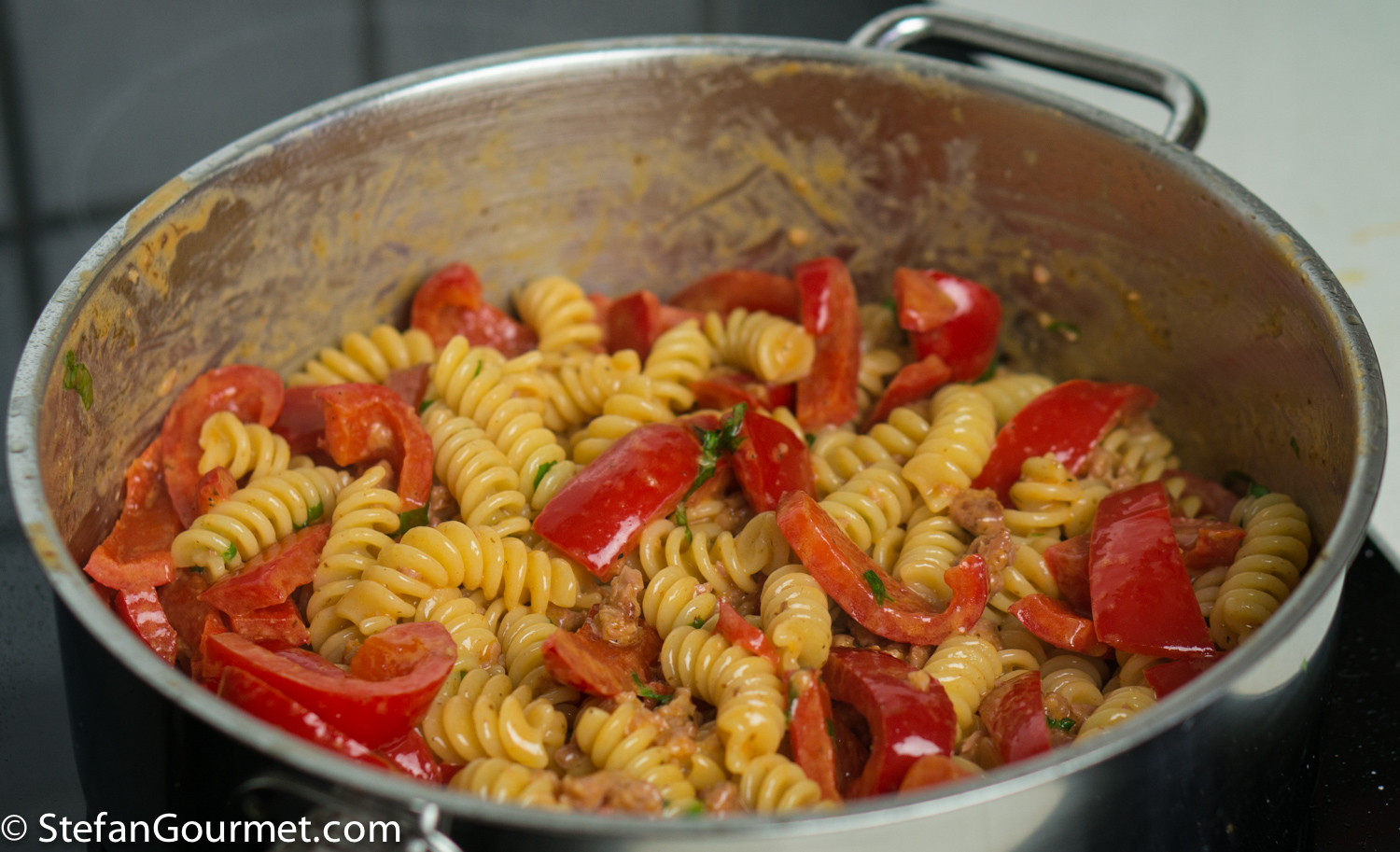 Fusilli are one of my favorite pasta shapes, because they absorb the sauce so well. You could also make this with other pasta, but short pasta like penne or farfalle is preferred because of the chunky structure of the sauce. Long pasta like spaghetti is more adapted for a smoother sauce.
