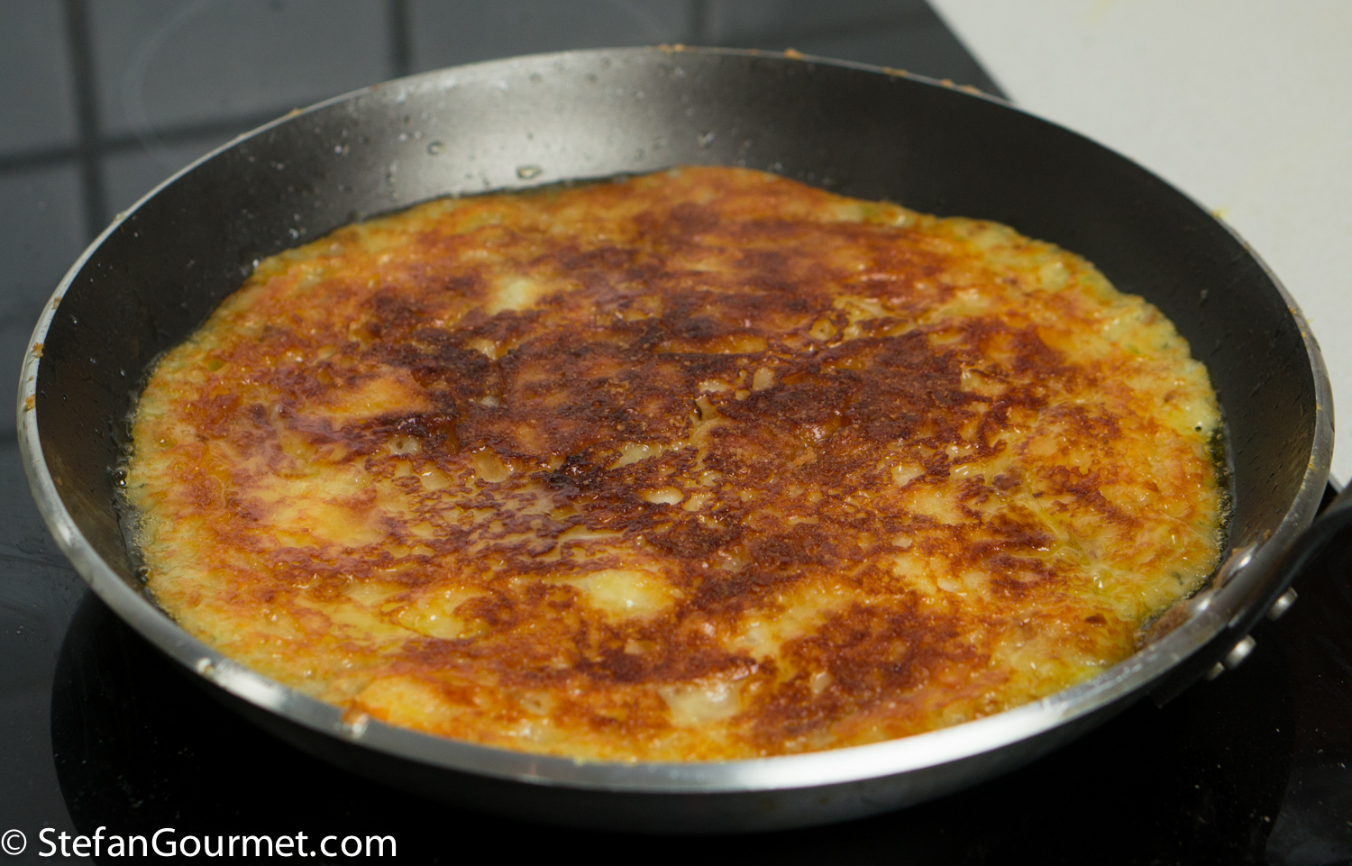 Flip the frico with the help of a plate, or with some wrist action if you dare. Kees turned it for me using the same technique (i.e. wrist action) we use for pancakes.