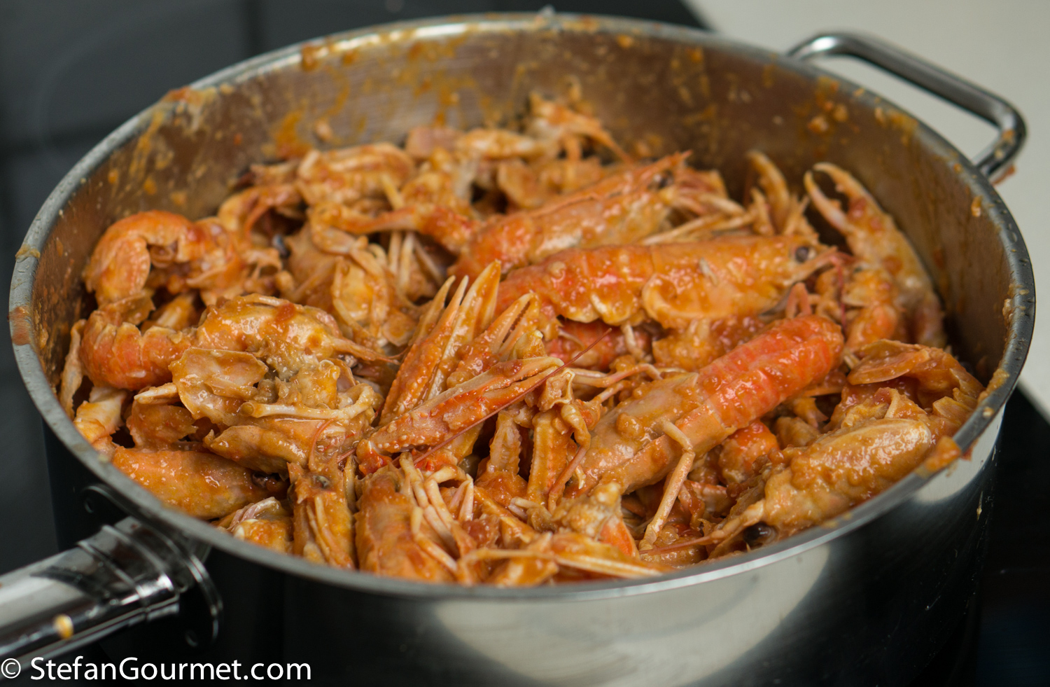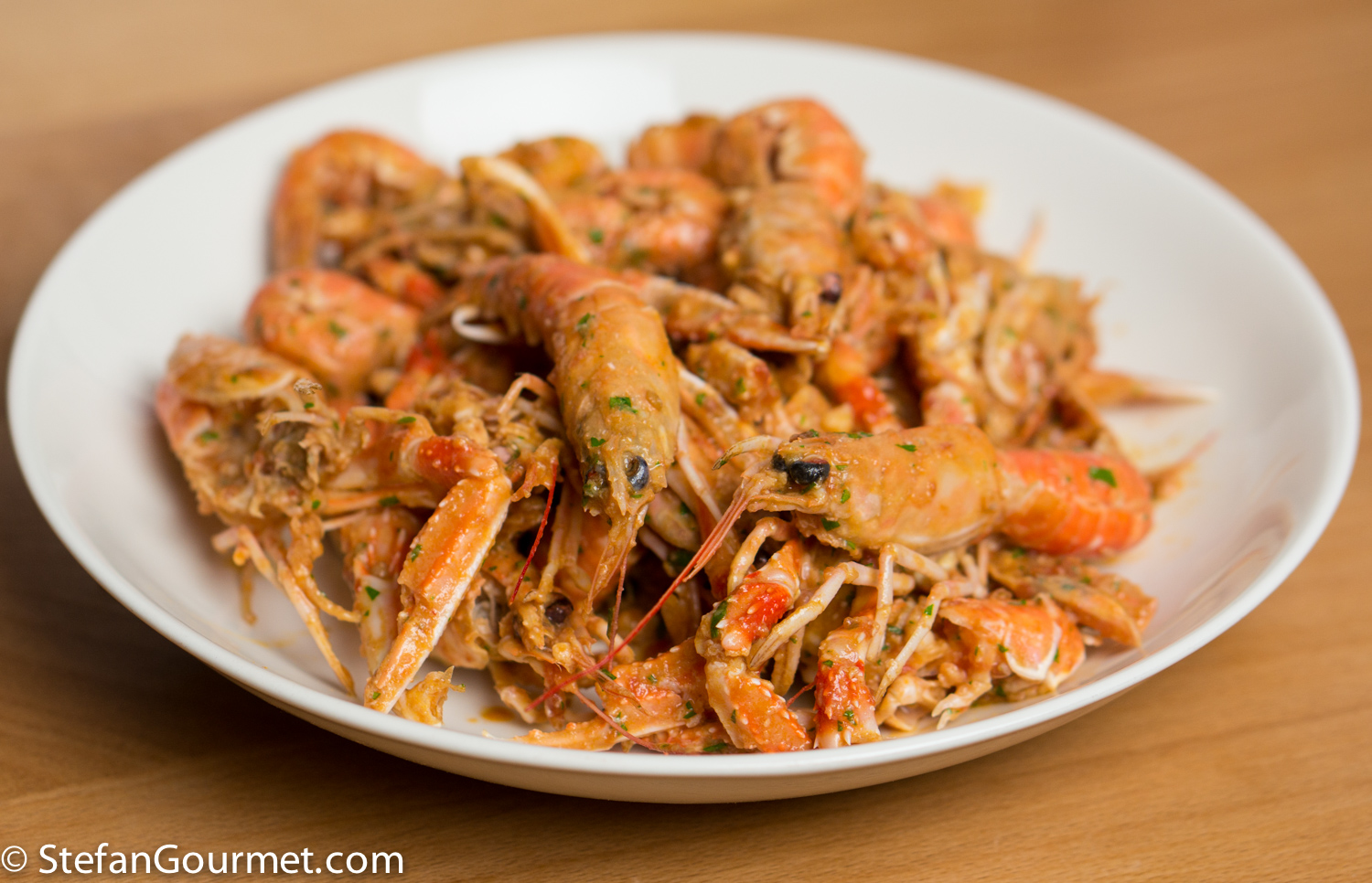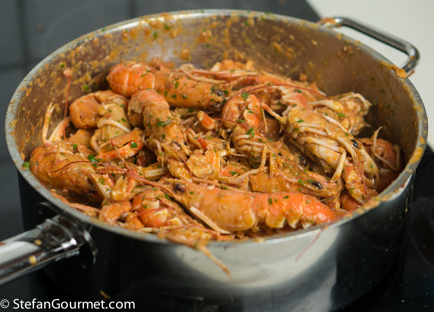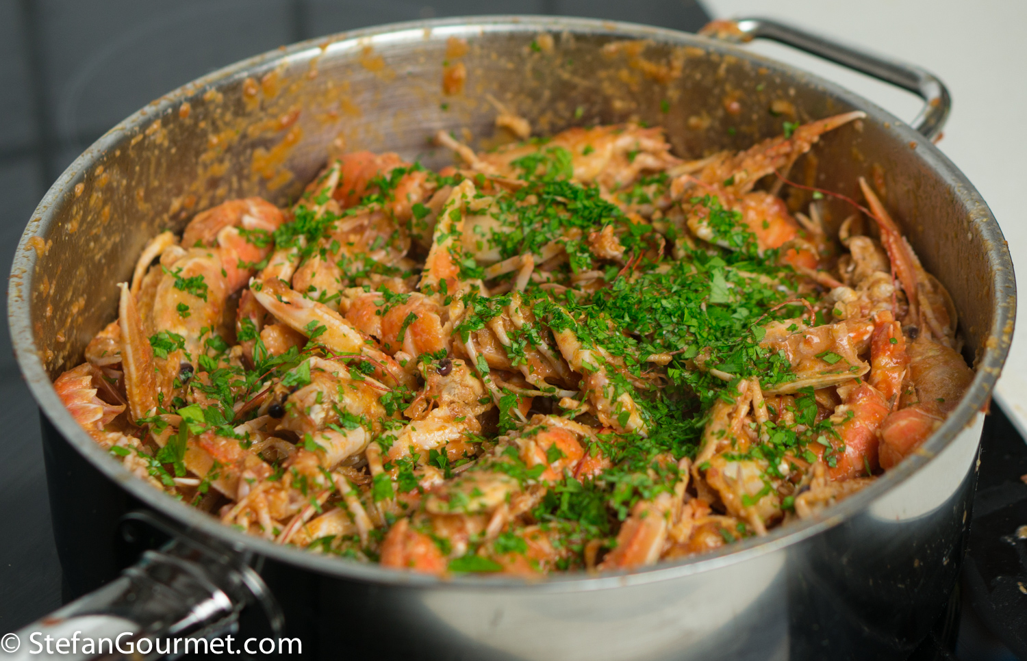 By including them in the dish this way (they will be discarded before serving), there will be just a hint of chilli and garlic in the dish, which is just right for the delicate flavor of the scampi.