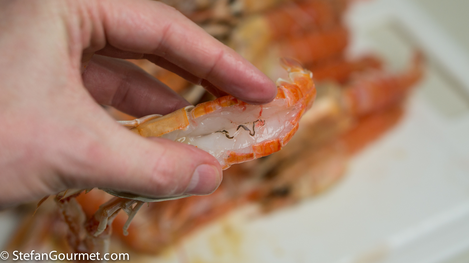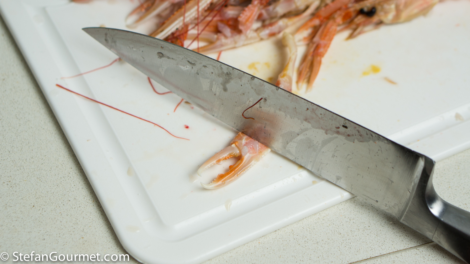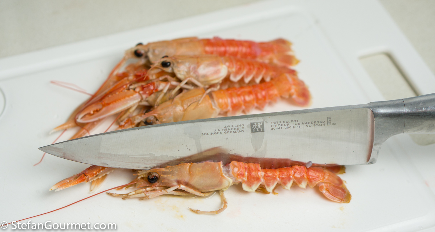 With a big chef’s knife, score the back of each scampo. This serves four purposes: