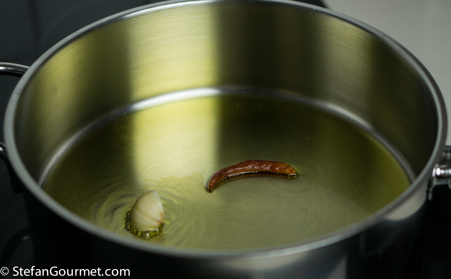 Heat a couple of tablespoons olive oil in a large frying pan and add a whole clove of garlic (peeled) and a chilli pepper. Stir them for a minute over medium high heat.