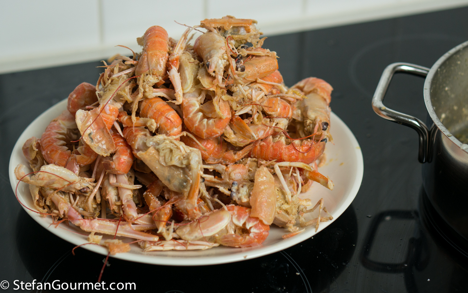 Škampi na Buzaru is a traditional dish from the peninsula of Istria in Croatia and another discovery from our recent vacation. It is prepared in nearby Italy as well, and there it is called Scampi alla Bùsara. Like with many traditional dishes, there are many variations on the recipe. The constant factor is that scampi are cooked in a sauce with white wine and bread crumbs, with tomatoes (rosso) or without tomatoes (bianco). It is quite easy to make and absolutely delicious. It is fingerlickingly delicious in fact, which is a good thing as you need to eat them with your hands and you will be licking your fingers!