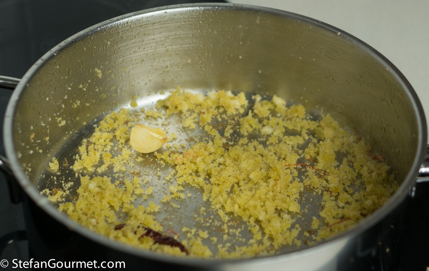 To the same pan, add 30 grams (1 oz) crumbs from day old bread.
