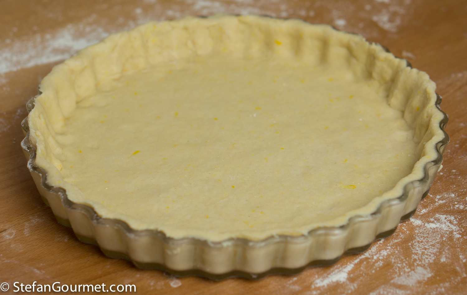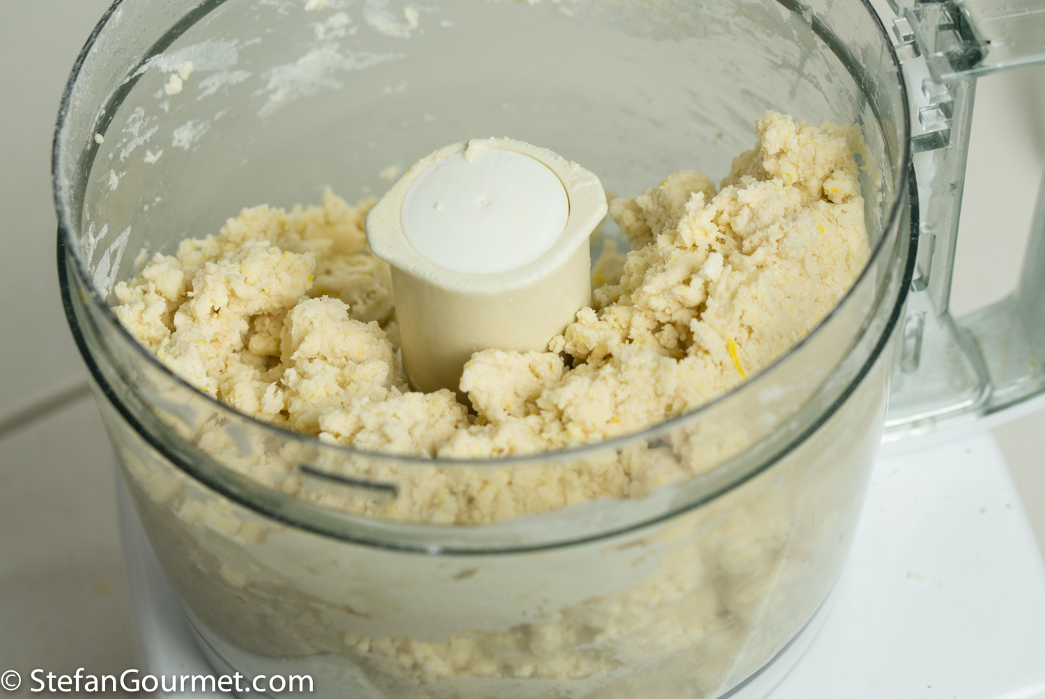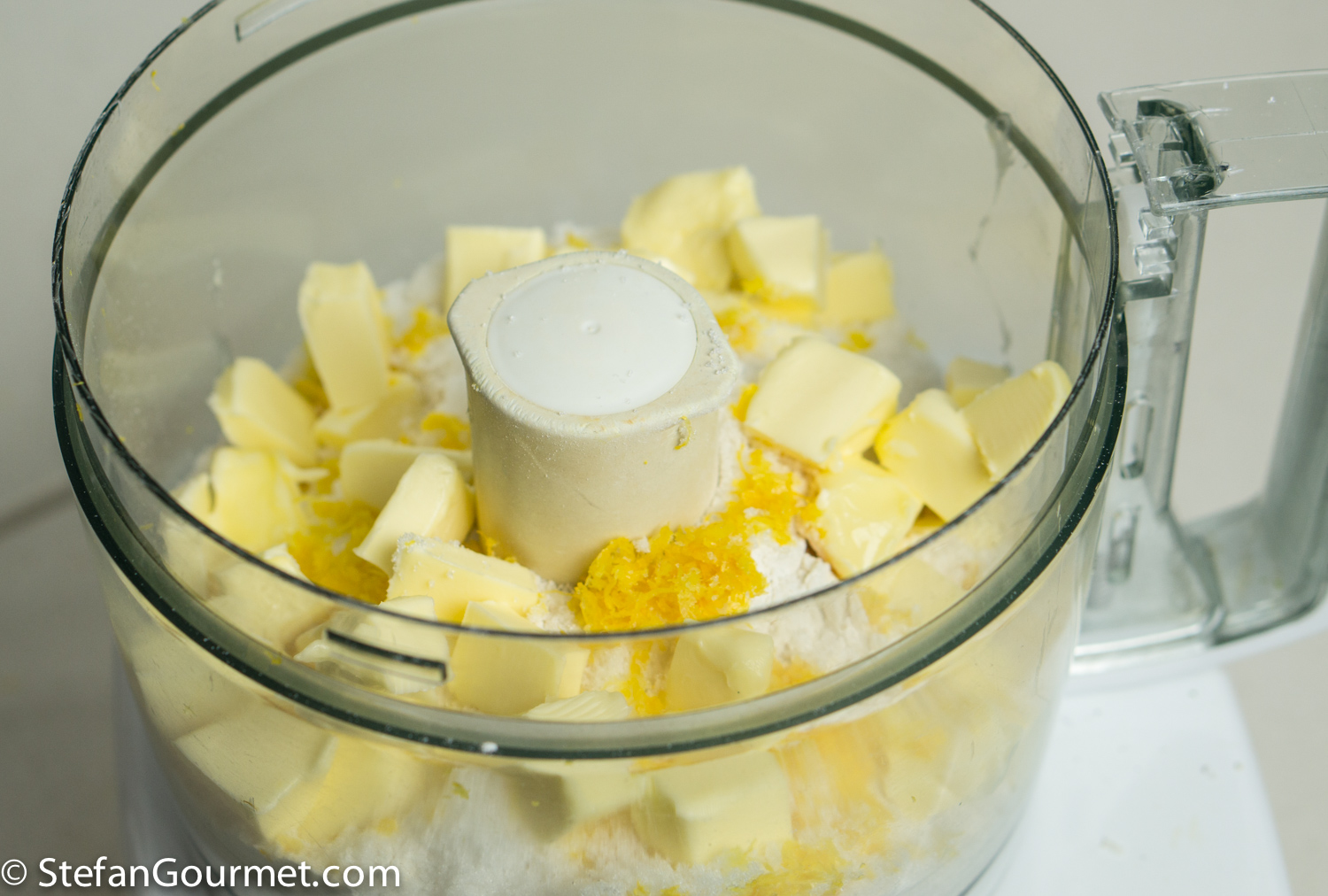 Combine 300 grams pastry flour, 2 Tbsp sugar, the grated zest of a lemon, 120 grams butter and a pinch of salt in the bowl of the food processor.
