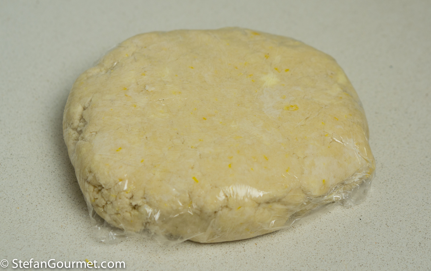 Gather into a ball, flatten it to a disc, wrap in cling film, and refrigerate for half an hour. You should still see small pieces of butter in the dough.