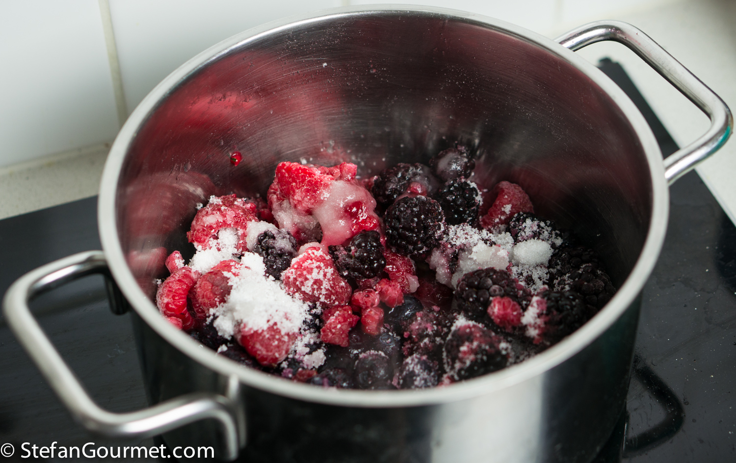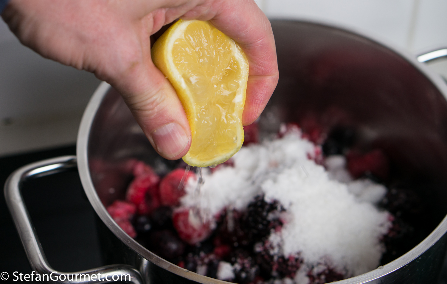 Put 150 grams raspberries, 150 grams blueberries and 150 grams blackberries in a saucepan. Add 50 grams sugar and the juice of 1/2 lemon.