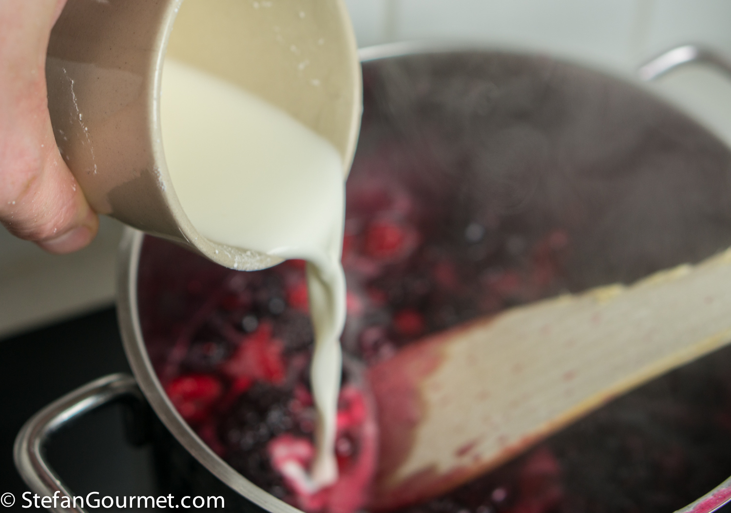 When it boils, mix 2 Tbsp corn starch with 2 Tbsp cold water to make a slurry, and add the slurry to the berry mixture.