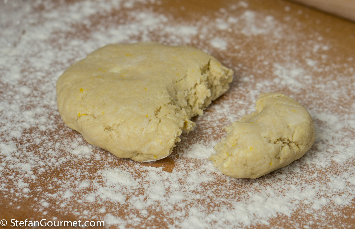 After the dough has rested, divide it into 3/4 and 1/4, and put it on a floured work surface (a wooden surface works best).