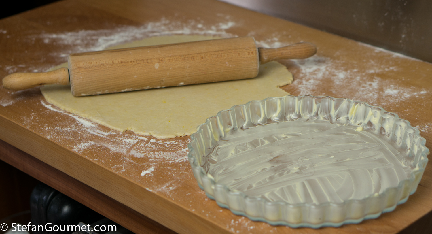 Butter a 27 cm (11″) tart pan. Give the large piece of dough a round shape with your hands, then roll it out with a rolling pin until it is the right size for the tart pan including the borders (i.e. about 32 cm or 13″). Roll out in different directions, starting from the center. That is the best way to roll it out in a circular shape.