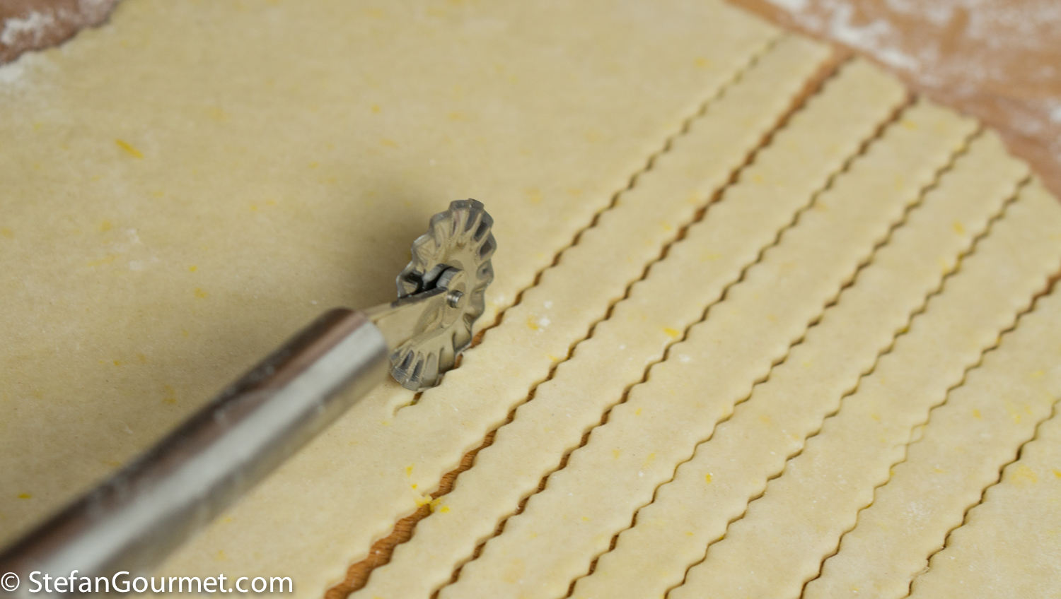 Roll out the remaining pastry, and use a pastry wheel to cut it into strips of about 1 cm (1/2 inch) wide. You could also use a knife, but with the wheel the strips will be more pretty. Pretty is important when baking.