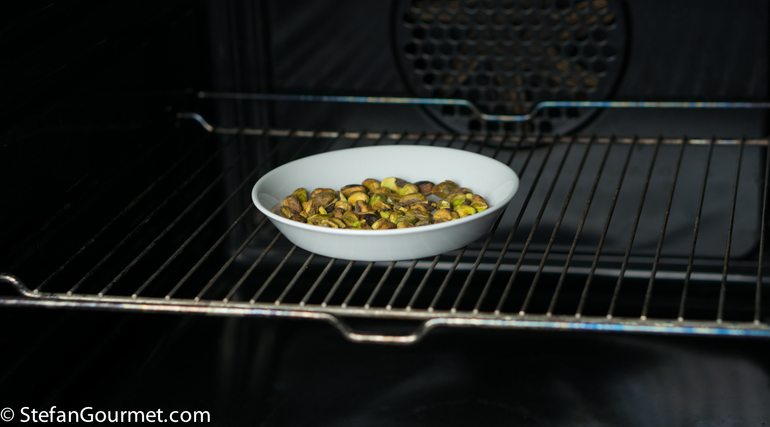 Toast 40 grams (1/4 cup) of shelled pistachios for about 8 minutes at 180C/350F. You can also toast them in a frying pan, but I find toasting nuts in the oven much easier as there is less risk of burning and they will be toasted more evenly.