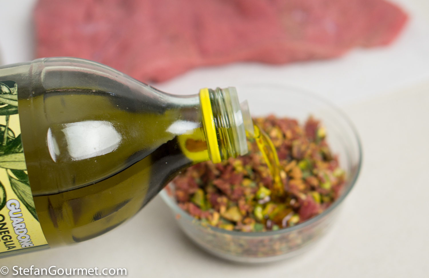Put the minced prosciutto – pistachios – sage mixture in a small bowl and add about a tablespoon of olive oil. Stir to mix.