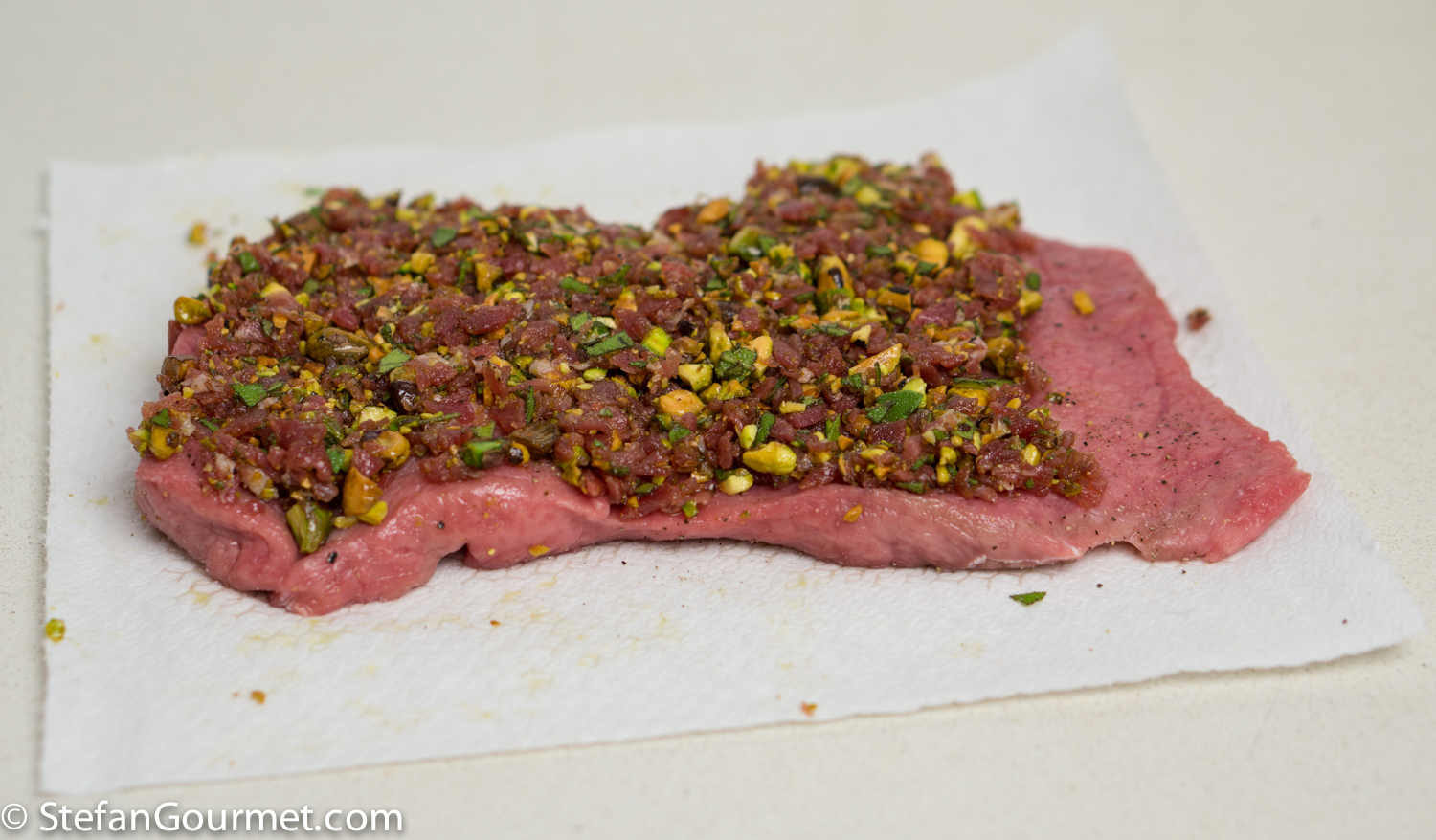 The combination of veal, prosciutto and sage is well-known from Saltimbocca. The addition of toasted pistachios adds an interesting element in terms of both texture and flavor. Here’s what I did…