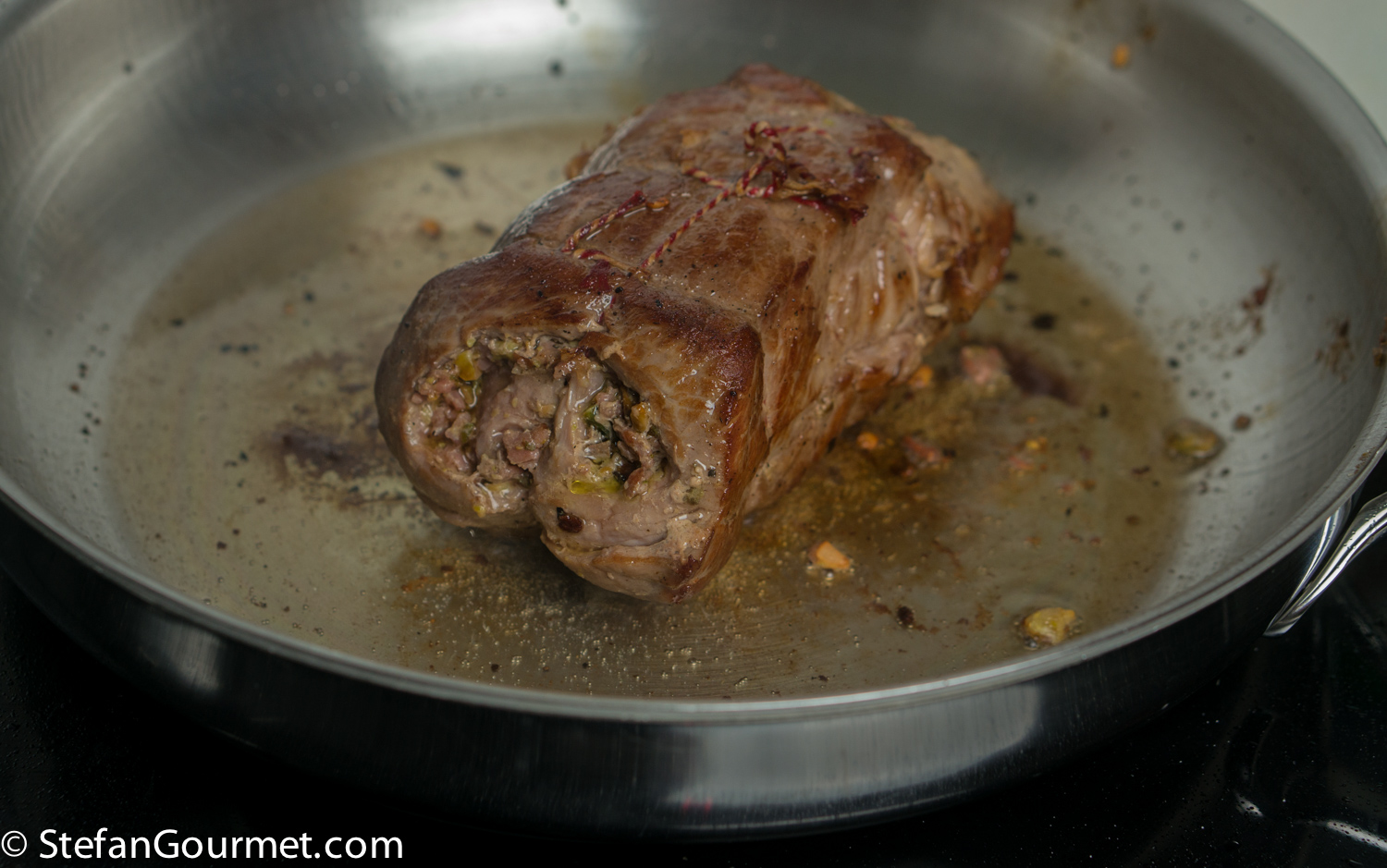 [When cooking in the oven, cook the meat in the oven at 160C/320F until a meat thermometer inserted in the center of the roulade registers 55C/131F. Then take the meat ouf of the oven and wrap in aluminum foil while you finish the sauce.]